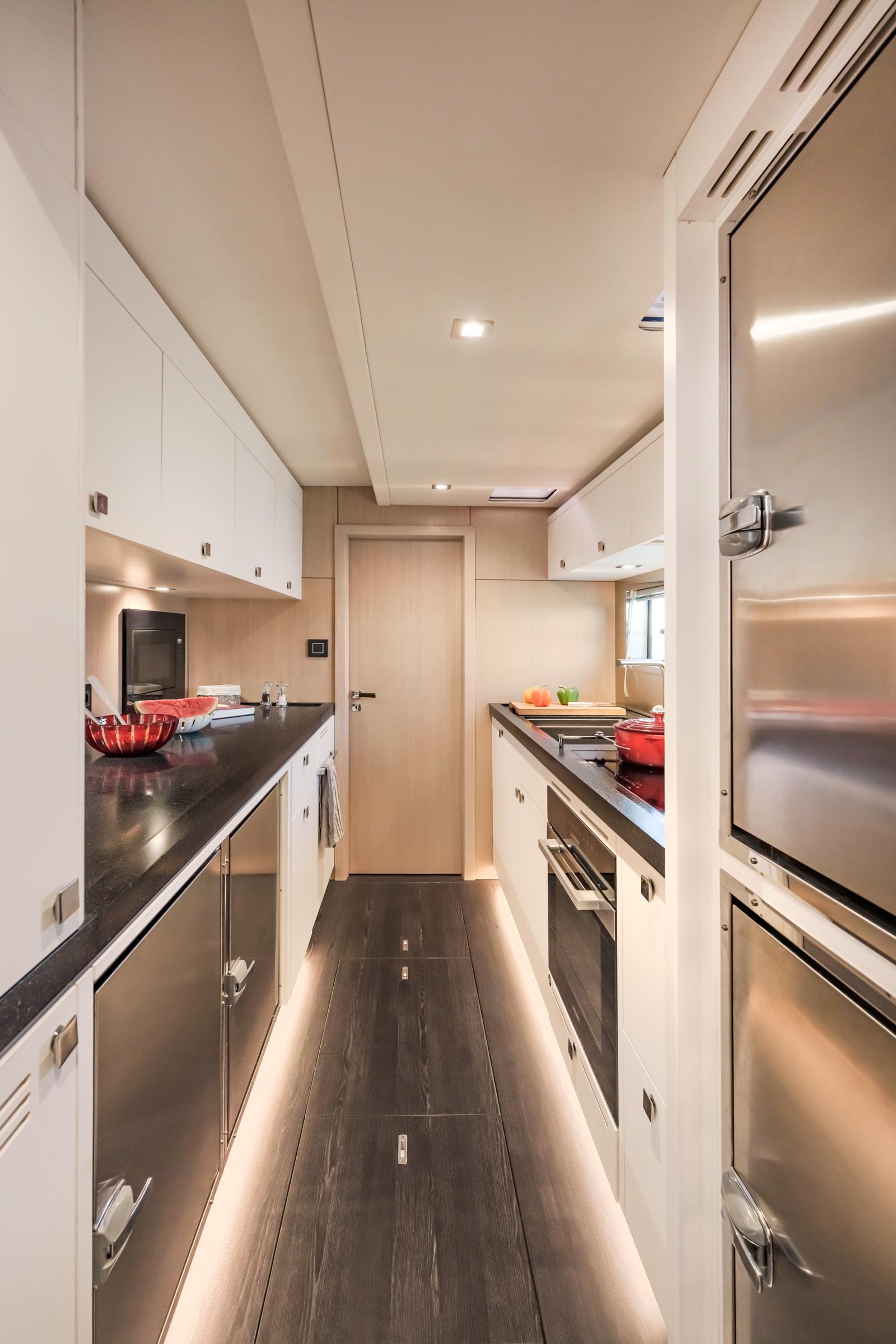 The adjustable interior layouts on the new Privilge Signature 650 reflect the individual nature of the yacht owner. The versatile convertible layouts available with the galley down version adapt to all your living requirements from casual lounging to formal dining and everything in between. The salon aboard the new Signature 650 is larger than its predecessor and the windows at the front have been set further forward and closer to the vertical.
