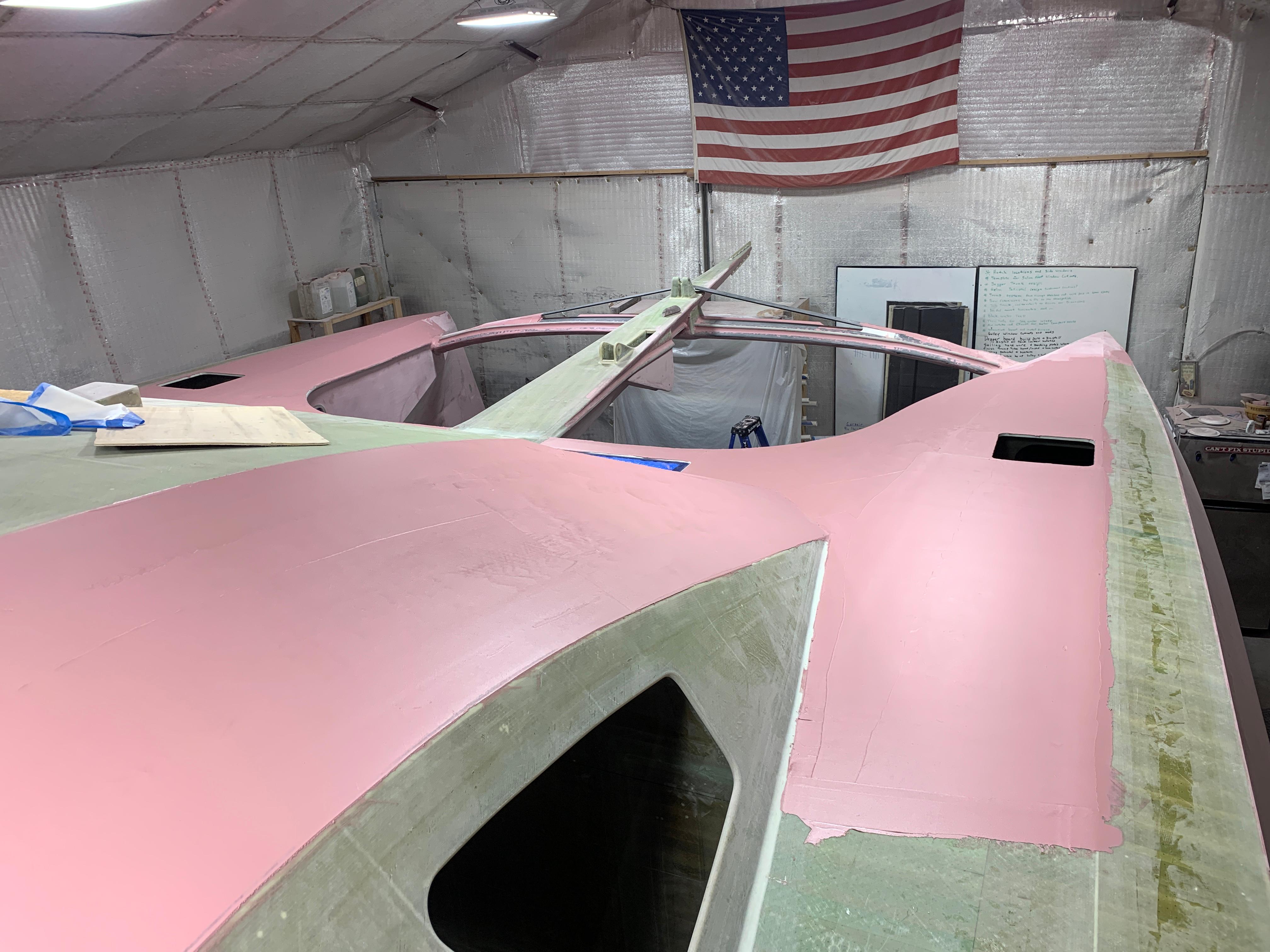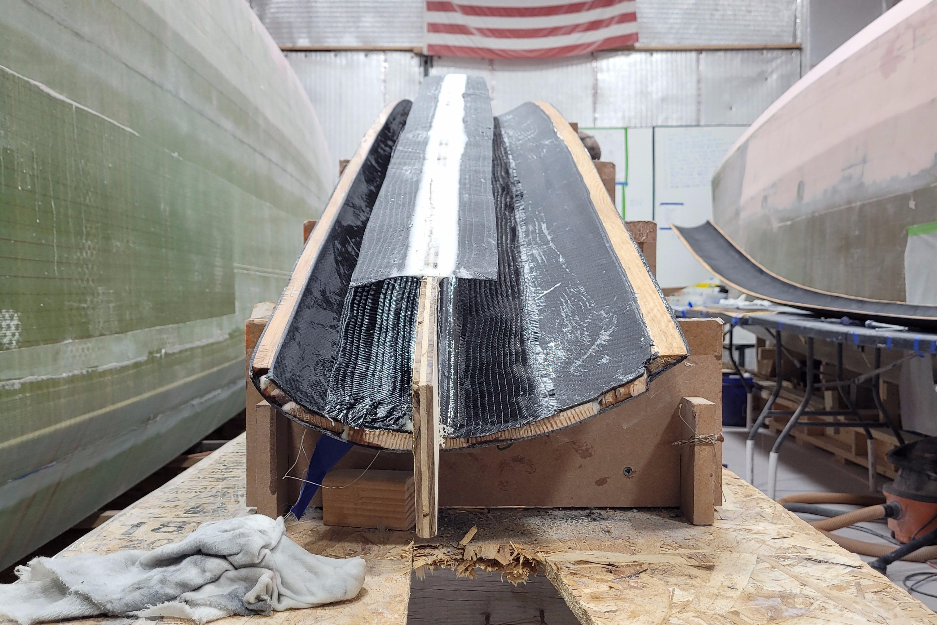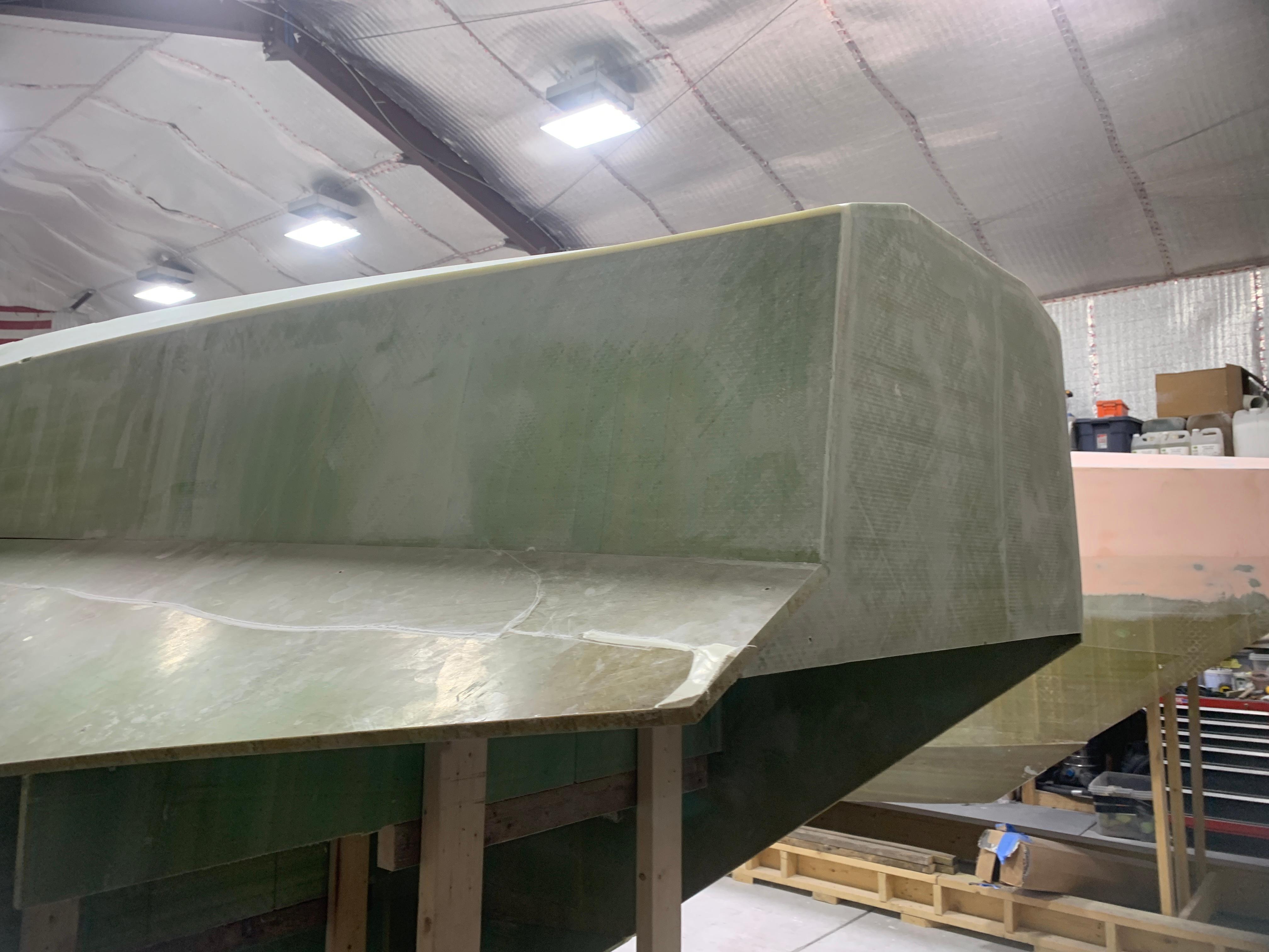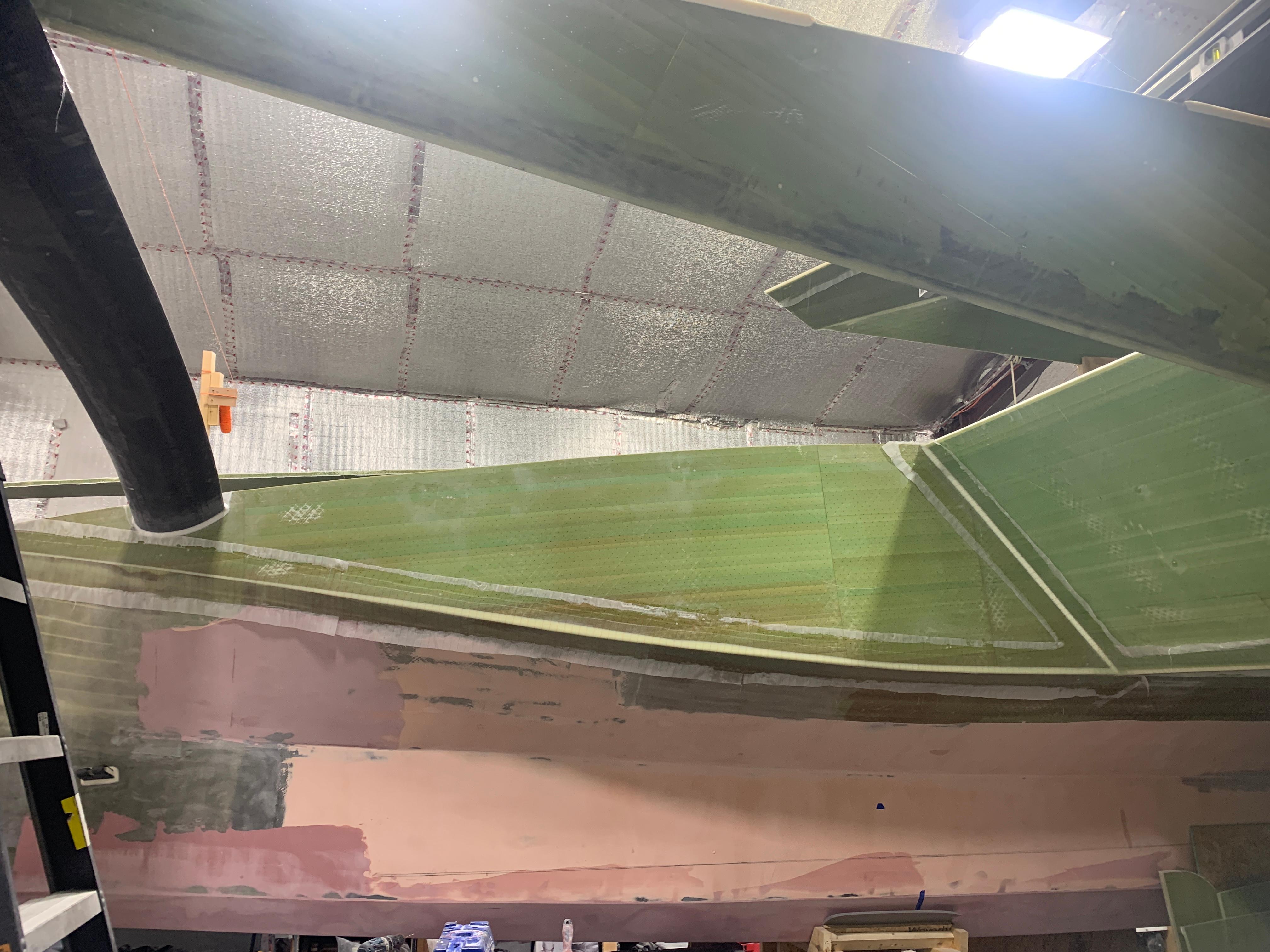 Joined with cabosil/cotton flock high density fillers and epoxy/fiberglass tape lines Faired with epoxy 2 part fairing compound