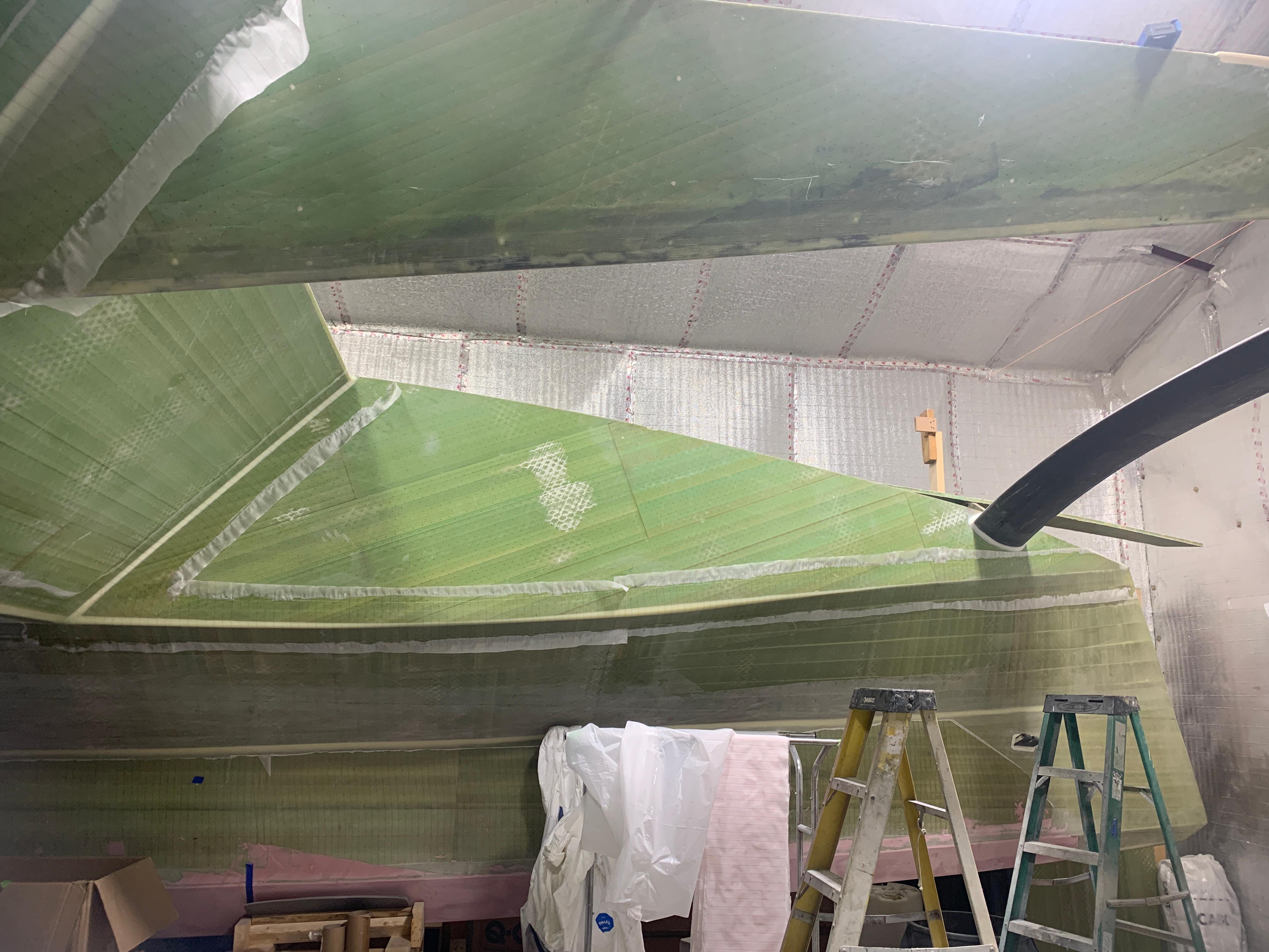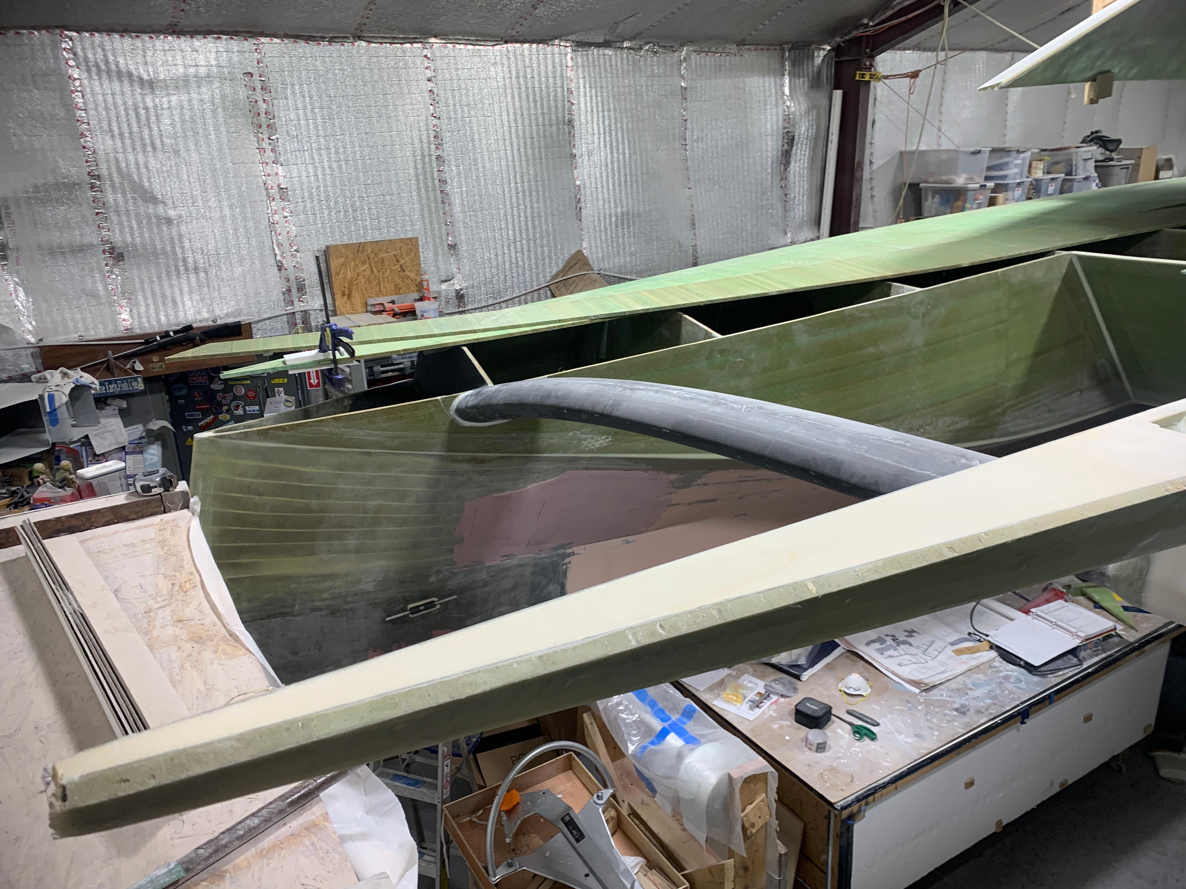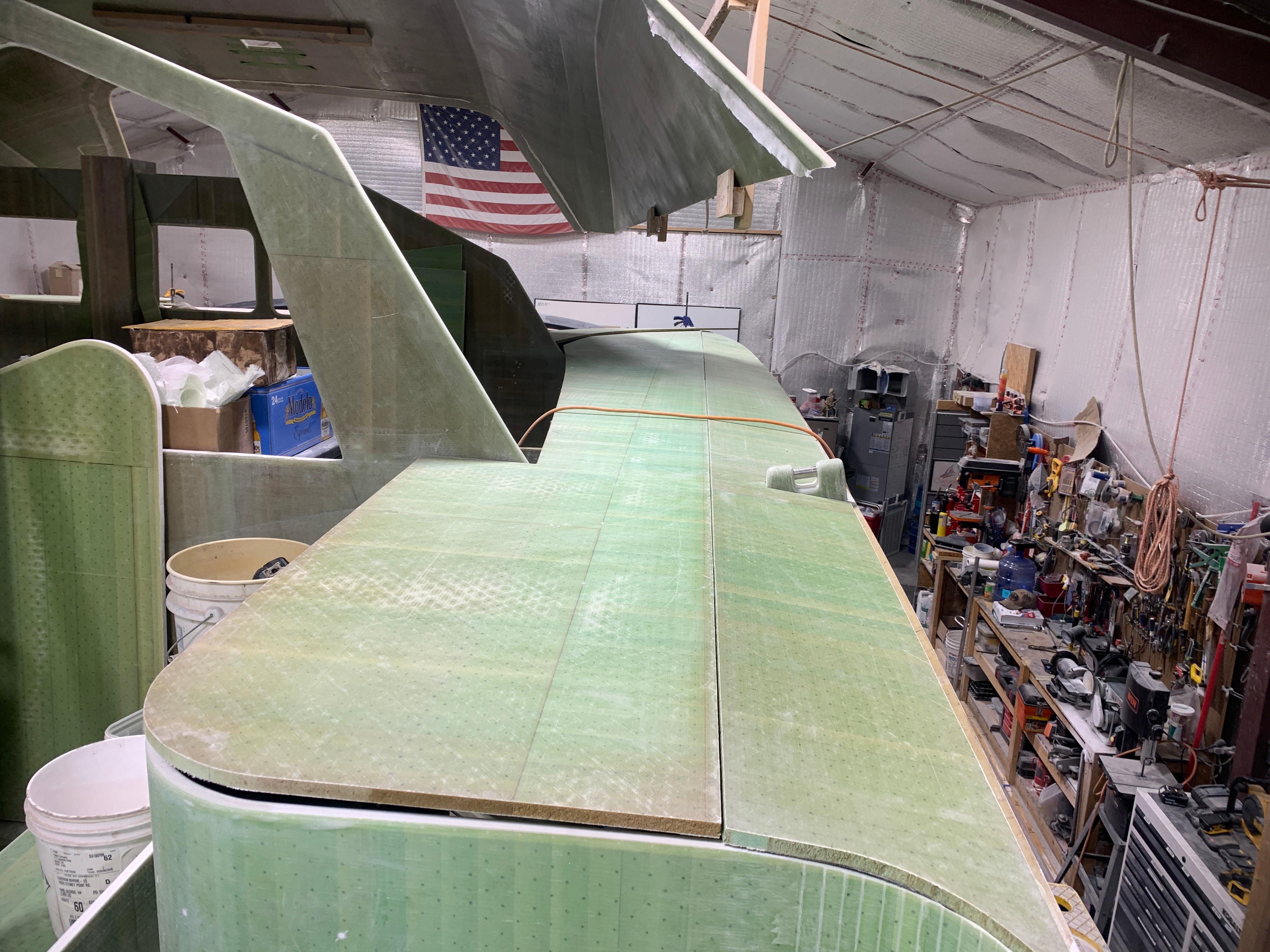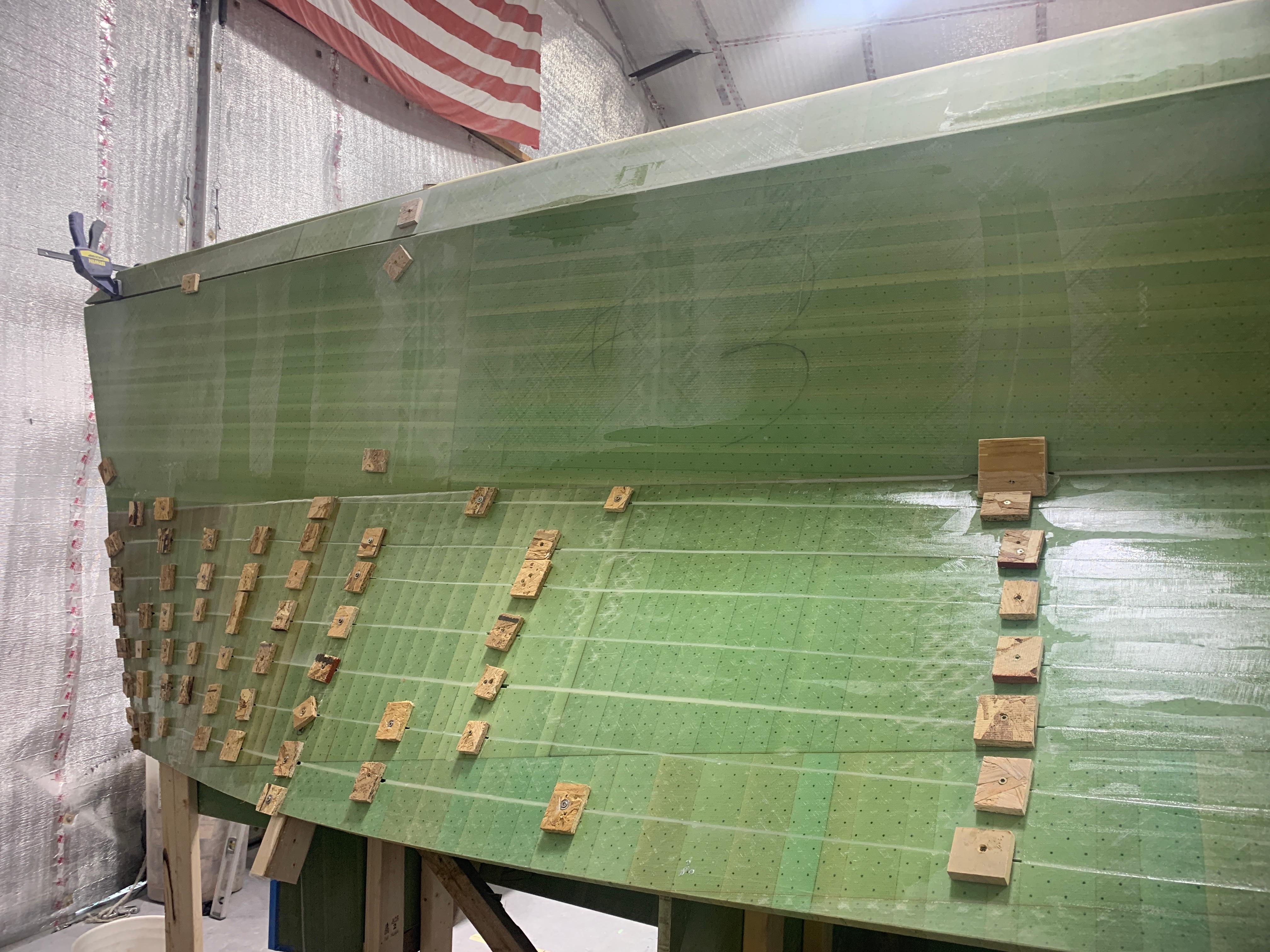 Joined with cabosil/cotton flock high density fillers and epoxy/fiberglass tape lines Faired with epoxy 2 part fairing compound