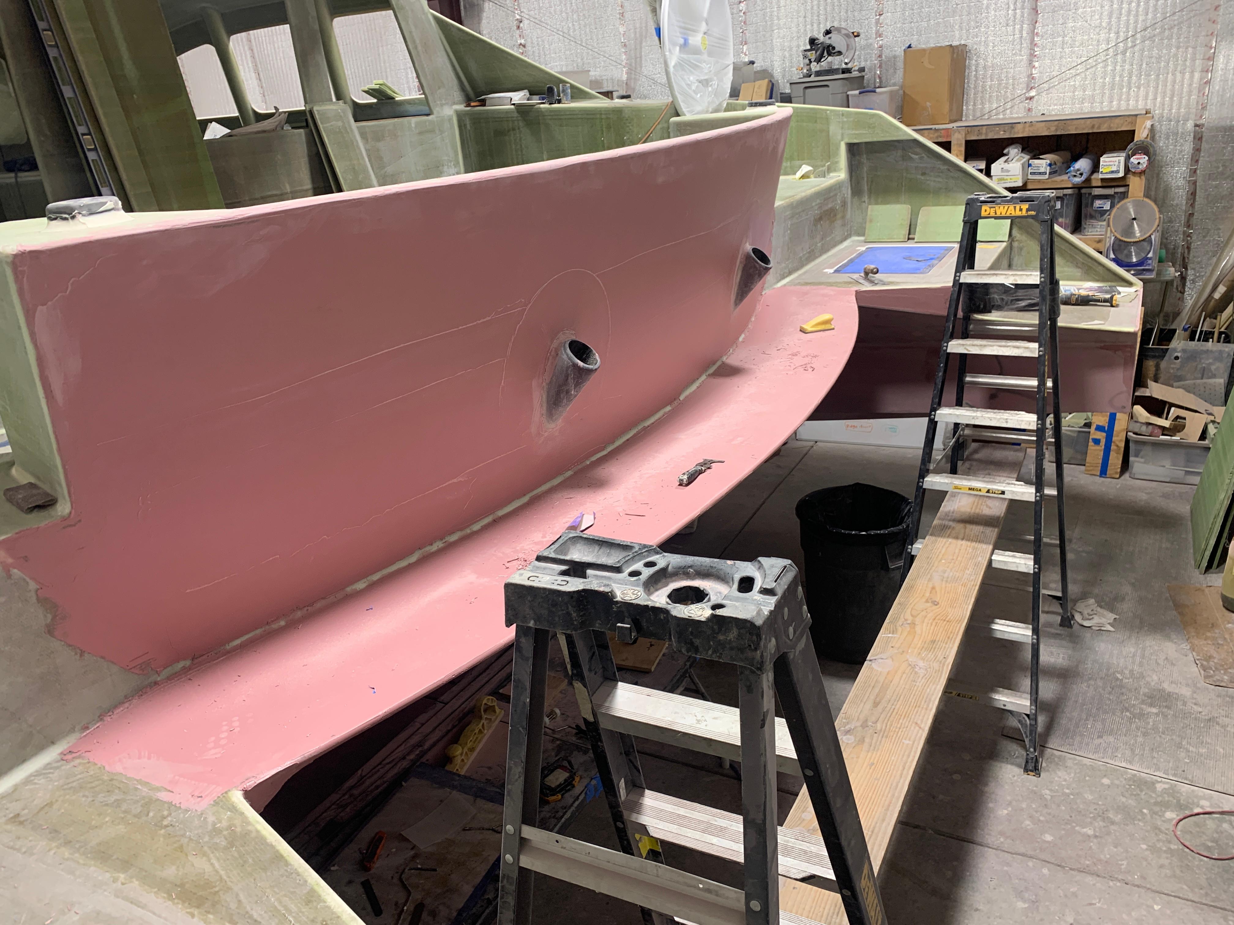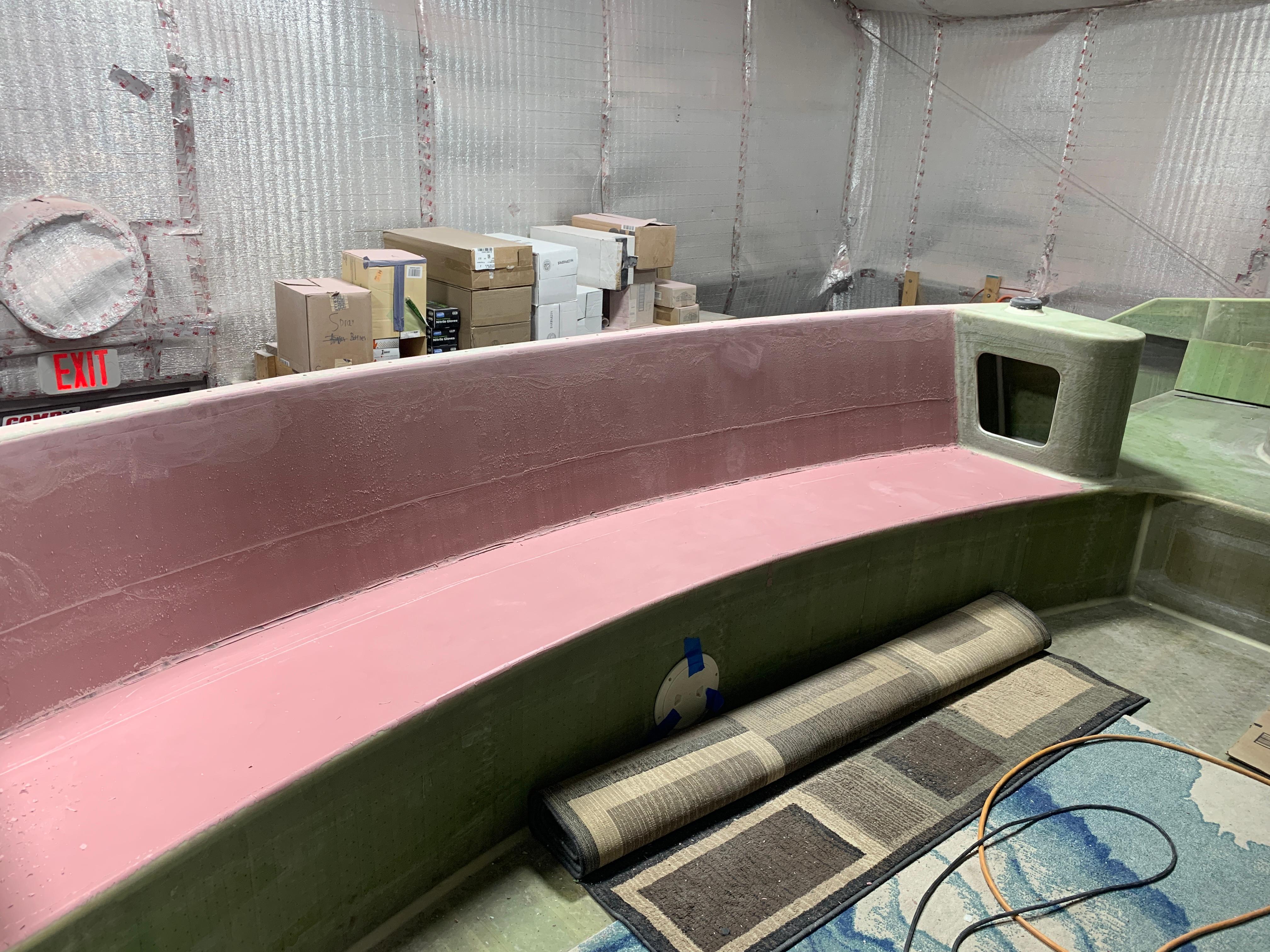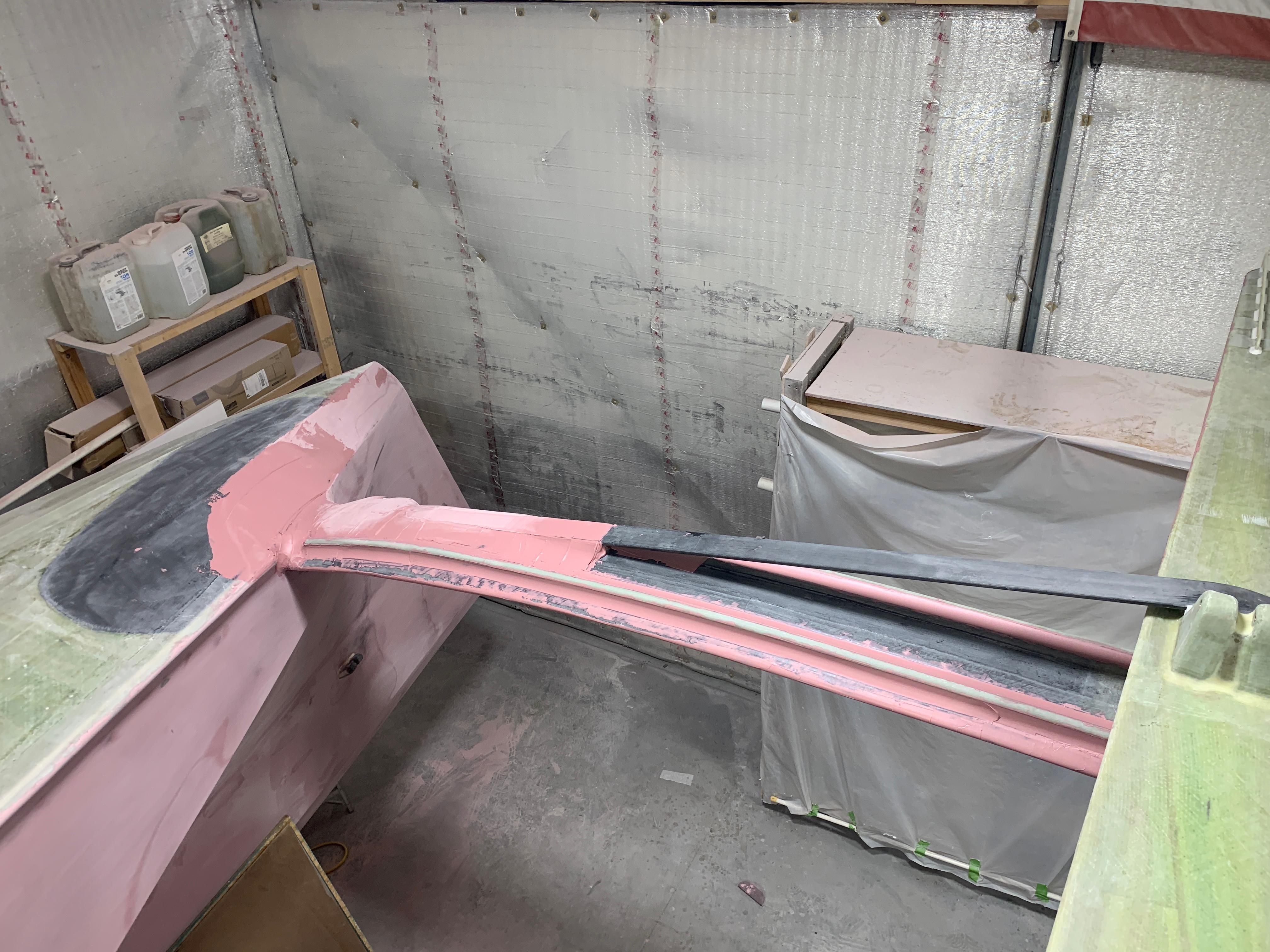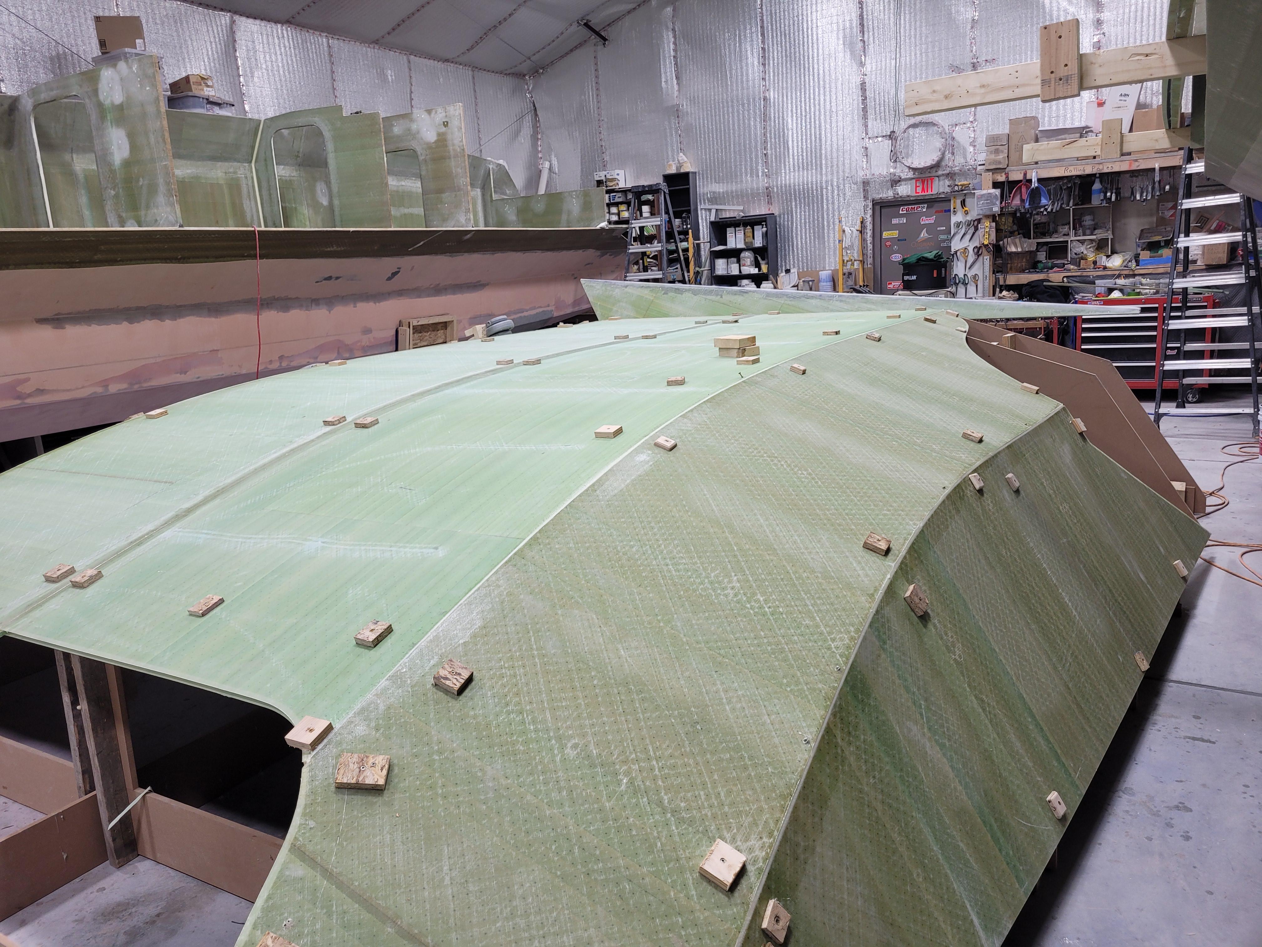 Joined with cabosil/cotton flock high density fillers and epoxy/fiberglass tape lines Faired with epoxy 2 part fairing compound