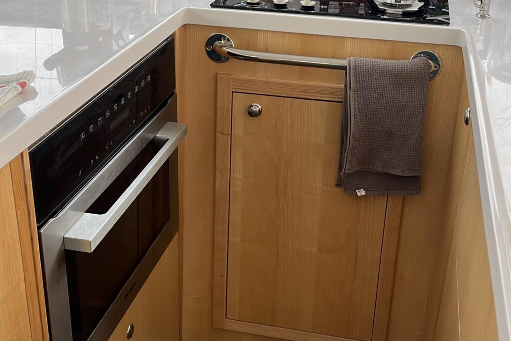 Spacious galley with co-ordinated Polystone counter surfaces, timber accents