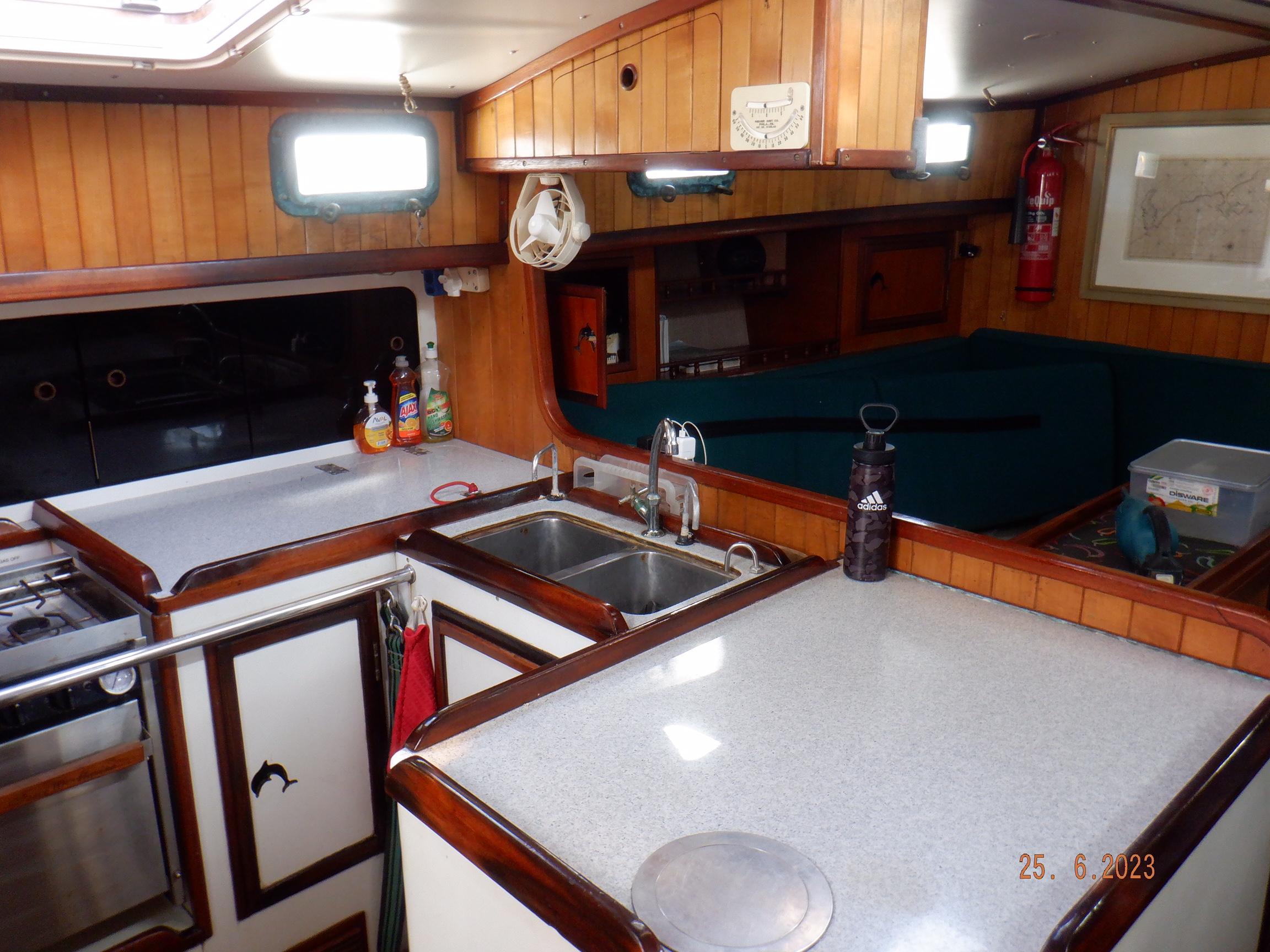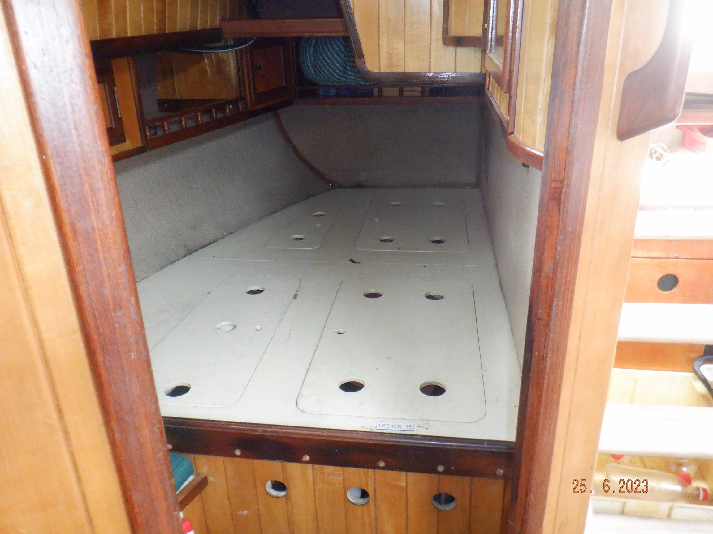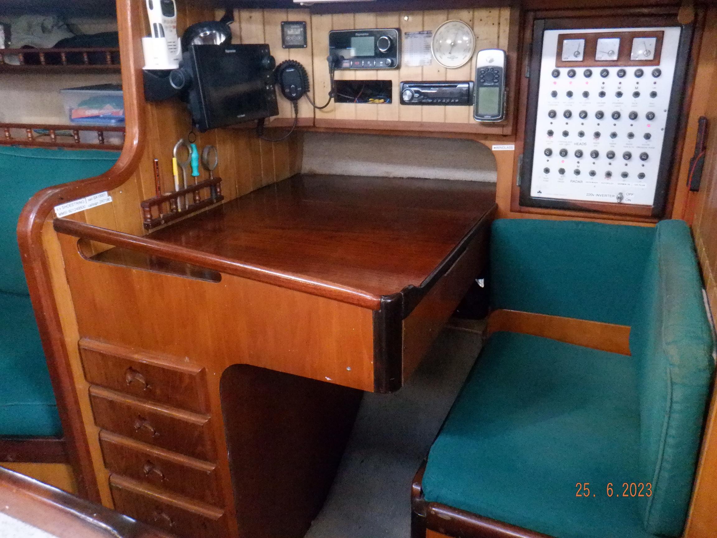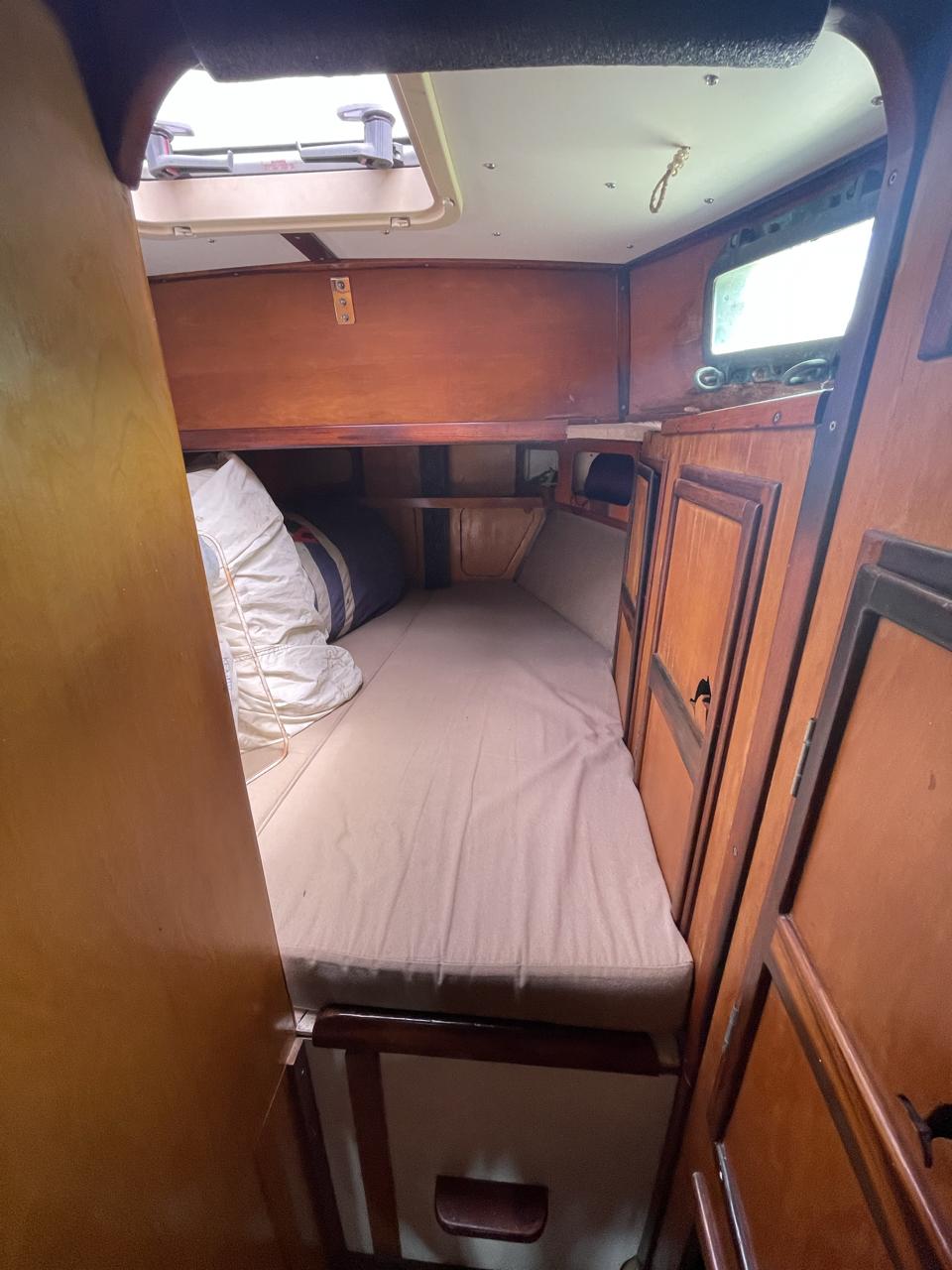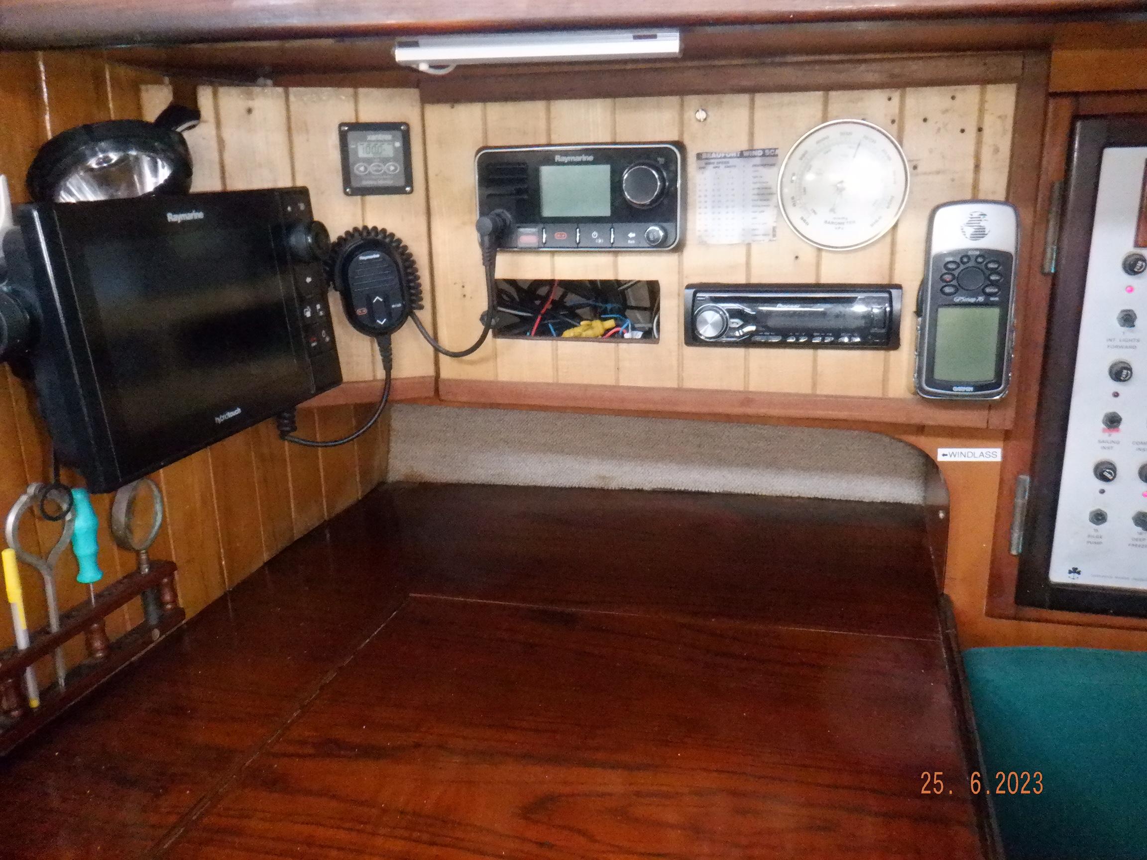Equipment List Rig/Sails Sparcraft mast and boom, twin spreader. Cutter rigged with masthead staysail. Mast steps up to lower spreaders then a single pair at mast head to provide stability when working at masthead. Removable running backstays Twin backstays 3 forestays. Main forestay to bowsprit end with Profurl furler for genoa. Masthead. Inner forestay to bowsprit base for hank-on staysail. Masthead, making for a well secured mast. Highfield Quick release lever at base. Inner inner forestay to upper spreaders for storm jib. Also Highfield quick release lever at base. Bellamy kicker. Traveller 6 halyards with double purchace main halyard. Grannybar on starboard, with goody-bag designed for easy storage of winchhandle, sail ties, short lines etc. Spinaker pole, plus jockeypole. Ullman stackpack with adjustable lazyjacks. North fully battened mainsail with two reefs Ullman 110% genoa. North heavyduty #3 hank-on staysail, with 4 battens. (my favoured sail when on passage) Quantum reaching gennaker (good condition but colour has run) Storm trysail plus storm jib All sails in good working order. WINCHES IN COCKPIT Lewmar 56st primaries Lewmar 46st secondaries Portside cabintop:- Barlow 25 for toppinglift, reefing lines Starboard side cabintop:- Lewmar 46st for mainsheet, kicker, Cunningham ON MAST Port:- Lewmar 30st for staysail halyard, port spinaker halyard. Starboard :- Lewmar 30st for main halyard, genoa halyard, starboard spinaker halyard, stormjib halyard. Under boom:- for outhaul, plus can use for reefing lines, etc. ENGINE Yanmar 3JH40 common- rail diesel 40hp (hours currently 284hr June 2023) Installed late 2018 KM35 transmission, Vetus Bullflex coupling 30mm s/s propshaft. Fixed blade 17×13 propshaft TENDER/DINGHY ZODIAC 2.5m PVC inflatable (near the end of its life) Inflatable keel, grp over honeycomb floor panels MERCURY 5hp outboard with remote fueltank Paddles and pump, anchor and rode ELECTRONICS (all installed 2016/7) AT NAVSTATION Raymarine eS97 chartplotter/MFD Raymarine Ray60 vhf radio with DSC AIS 650 transceiver Raymarine ACU200 autopilot control (Robertson HLD2000 Mk2L hydraulic ram at rudder quadrant) Garmin GPSmap76 handheld (old & never used, but working. Uniden Atlantis250 handheld VHF (old and battery failing) IN COCKPIT Raymarine eS75 chartplotter/MFD Raymarine P70 autopilot control Raymarine i60 wind instrument Raymarine i70 multipurpose instrument Raymic VHF handheld plus active speaker ON MAST Raymarine Quantum radar ELECTRICS Eclectic Energy D400 wind generator with Xantrex charge/load controller 300w solar panel with Victron MPPT 100/15 controller Xantrex battery monitor 2 off Lifeline AGM GPL-8DL 255ah house batteries 1off xStream Power MF115D31R 85ah cranking amps 830amps engine start battery. Victron blue-smart 30a battery charger Victron Phoenix 12/800 inverter Four electric bilge-pumps in bilge, for quick clearance of water. One extra large manual bilgepump in saloon area. WINDLASS/GROUNDTACKLE Maxwell RC10/10 1200w 12v vertical axis, with capstan. Maxwell Autoachor 710/6 cordless remote control. Secondary Up/Down control box out of forecabin(thru hatch). Keeps switching equipment away from damp environments except when in use. VULCAN 20kg galvanized anchor FOB HP 20kg galvanized backup anchor CHAIN/RODE:- (connected) 70m of 10mm galvanized chain (backup) 30m of 10mm galvanised chain plus 50m of rode. Stored underforepeak bunk in separate locker, with tubular feed up into anchor locker on deck, connected permanently for quick access. ON DECK 2 dorades ahead of traveller feeding fresh air to galley and starboard aft cabin. Teak mounting brackets for boathook/paddles/oars/battens/etc. Sampsonpost with s/steel plate atop, useful when cutting/drilling etc. Ample cleats, fairleads, clutches etc. Pressurised seawater deckwash outlet on portside deck. Various fenders, docklines. 2x 25liter diesel jugs. 1x 10liter petrol jug. GALLEY Force 10 2burner stove with oven/grille. Adjustable Potholder brackets, Gimballed. Replaced Jan 2020. Ample pots, pans, baking/roasting trays, pressure cooker, s/steel kettle. Full range of chefs equipment, knives, ladles, tongs, graters, etc etc etc. Six-piece cutlery (s/steel) crockery (melaware), mugs and glasses, with spares of certain items. Ample airtight containers for in-use ingredients, plus food storage. Double sink, fed by pressurised cold fresh water, footpumped drinking water, and footpumped seawater. HEADS Vaillant gas waterheater to handbasin, never used but tested from time to time. JABSCO compact electric toilet Pressurised hot/cold water to handbasin. Handshower incorporated into tap unit. SAFETY EQUIPMENT Viking 4man cassette liferaft, mounted in quick release bracket on deck. MOB horseshoe life-ring with danbouy. 4 x PFDs 6 x life jackets Waterproof canister with flares, smoke signals, mirror, etc. 2 off 2.5kg drypowder fire extinguishers. 1 off 2.0kg CO2 fire extinguisher. Rigging Shears (1/2 inch/ 12.7mm) capacity, brand new in box. Ullman sail repair kit MISCELLANEOUS Nikon 12×50 binoculars 2x goggles, 2x snorkels, 2x flippers Spareair 15min scuba tank 1 x scuba bottle (almost full, used to fill Spareair. 2 x sleeping bags Fitted sheets for all bunks, pillows and pillowslips 8 x scatter cushions for saloon Various bath towels, hand towels, beach towels, kitchen dish towels and hand towels. Gas braai/barbecue mounted on pushpit. Coldwater handshower in cockpit. Bosuns chair Rope climbing kit for solo mast climbing 12v air compressor 2 x boathooks Full set of handtools (all mounted) to carry out any repairs/service. Makita 18v cordless anglegrinder Makita 18v cordless 13mm drill Makita 18v cordless 10mm angledrill Makita 18v cordless orbital sander Makita 18v cordless jigsaw 220v/18v Makita charger 12v/18v Makita charger. 2off Makita 18v 5ahr batteries 1off Makita 18v 1.5ahr battery Makita18v cordless airblower Makita 18v cordless hand vacuum. Bench vice attached to workbench. Various spare belts, filters, nuts
