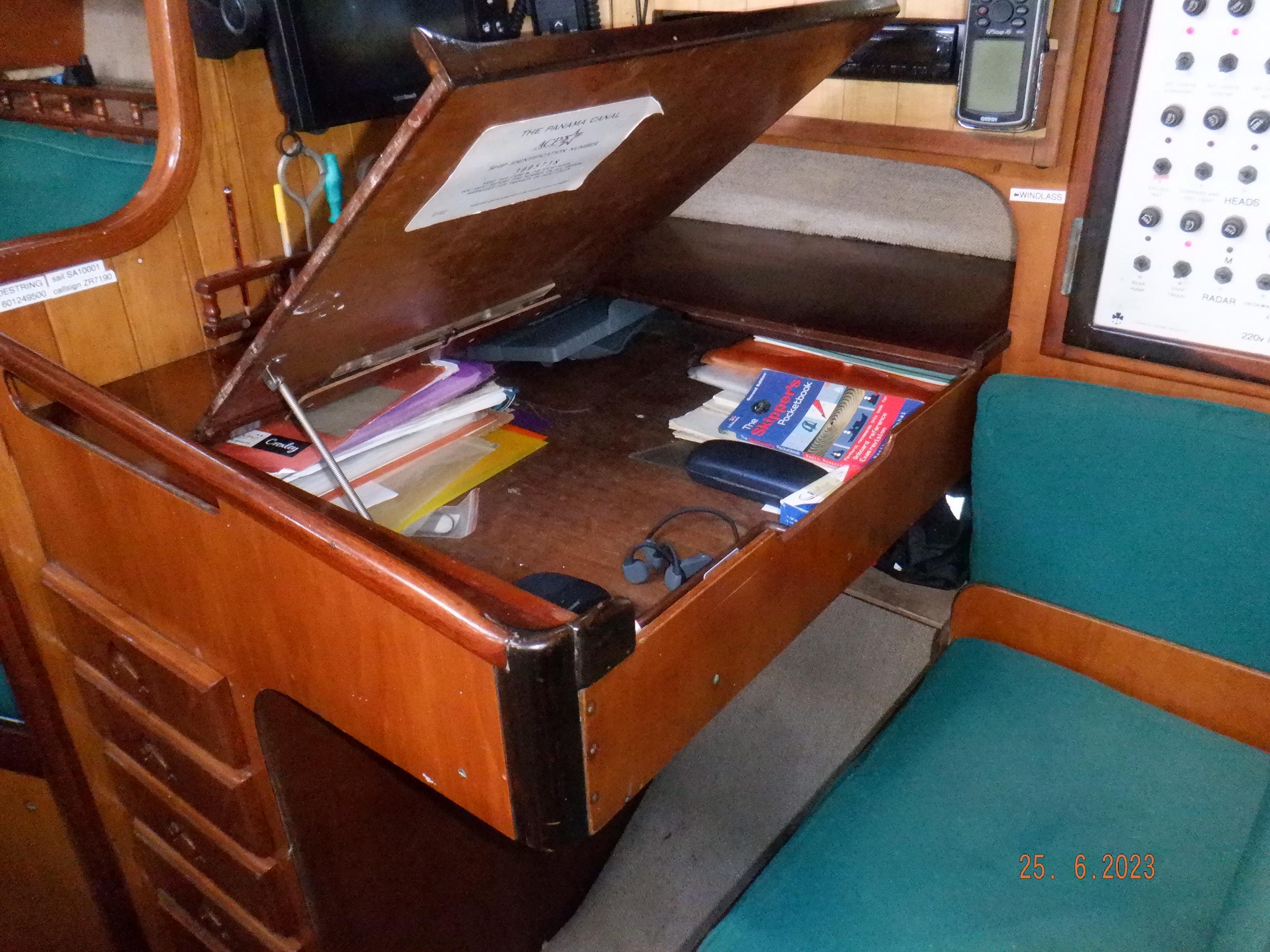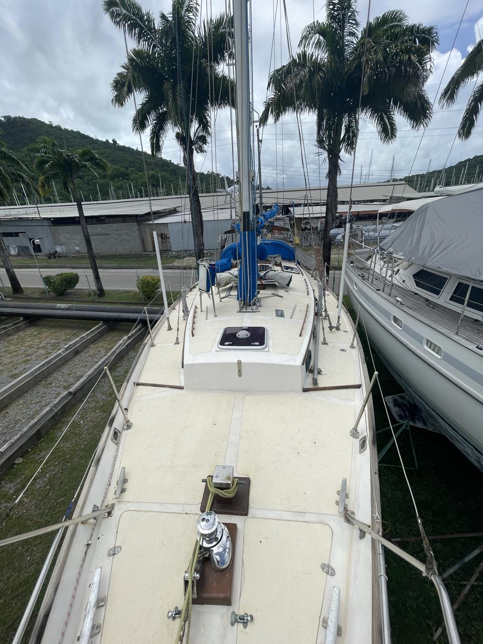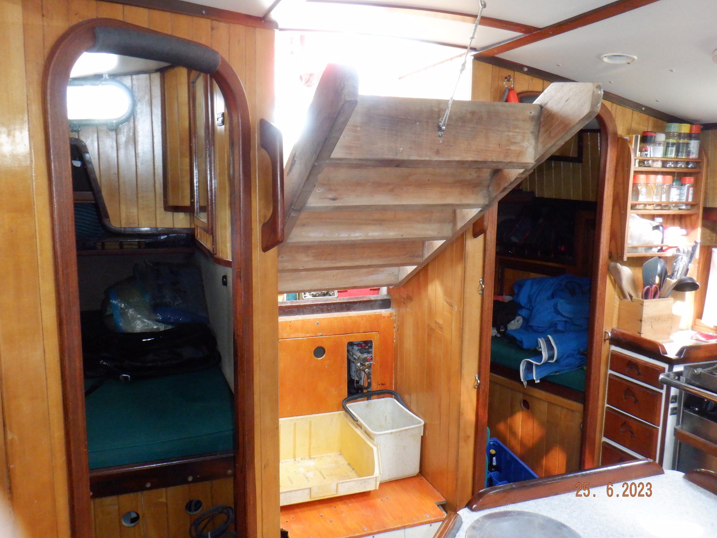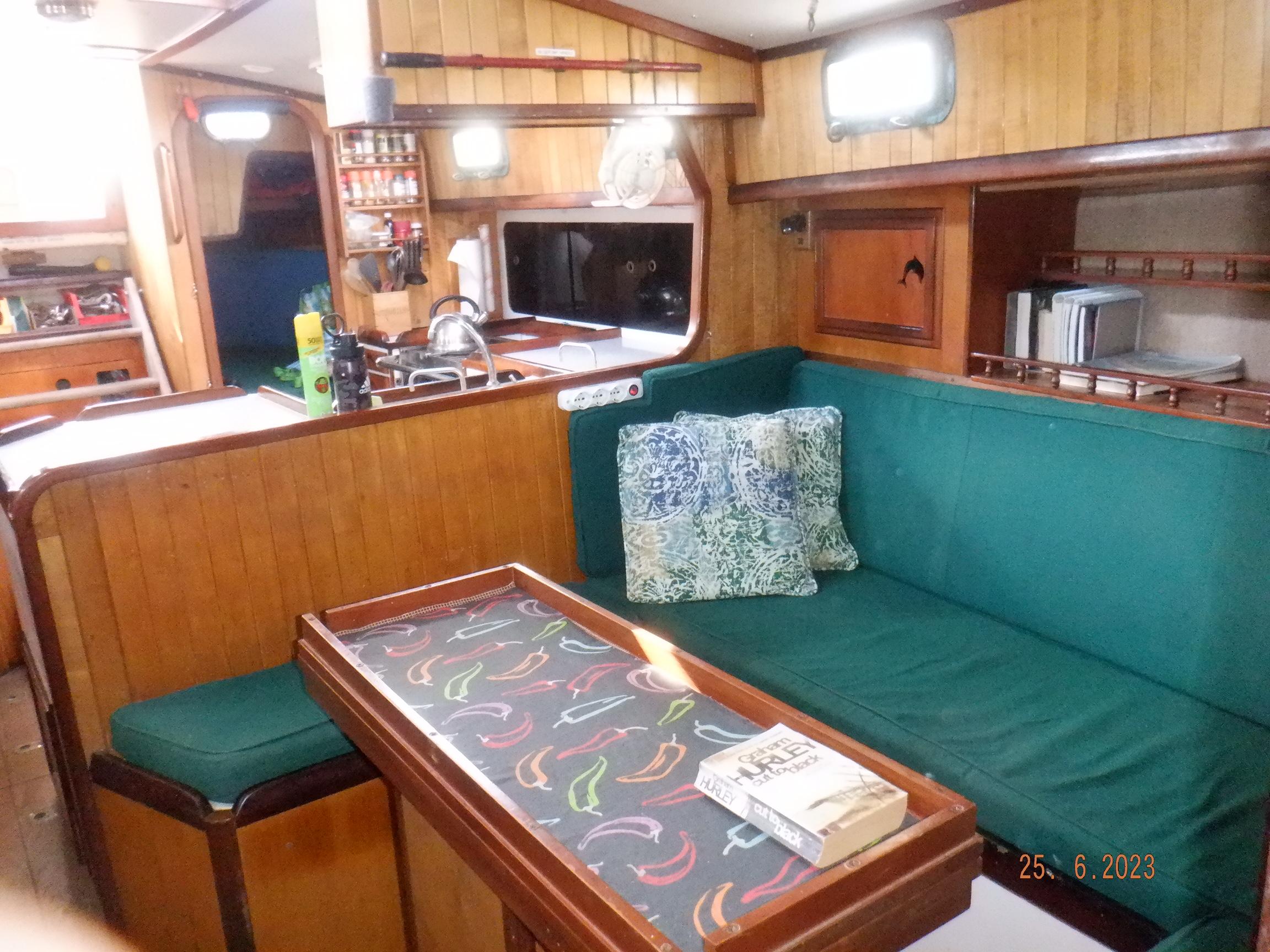 Equipment List Rig/Sails Sparcraft mast and boom, twin spreader. Cutter rigged with masthead staysail. Mast steps up to lower spreaders then a single pair at mast head to provide stability when working at masthead. Removable running backstays Twin backstays 3 forestays. Main forestay to bowsprit end with Profurl furler for genoa. Masthead. Inner forestay to bowsprit base for hank-on staysail. Masthead, making for a well secured mast. Highfield Quick release lever at base. Inner inner forestay to upper spreaders for storm jib. Also Highfield quick release lever at base. Bellamy kicker. Traveller 6 halyards with double purchace main halyard. Grannybar on starboard, with goody-bag designed for easy storage of winchhandle, sail ties, short lines etc. Spinaker pole, plus jockeypole. Ullman stackpack with adjustable lazyjacks. North fully battened mainsail with two reefs Ullman 110% genoa. North heavyduty #3 hank-on staysail, with 4 battens. (my favoured sail when on passage) Quantum reaching gennaker (good condition but colour has run) Storm trysail plus storm jib All sails in good working order. WINCHES IN COCKPIT Lewmar 56st primaries Lewmar 46st secondaries Portside cabintop:- Barlow 25 for toppinglift, reefing lines Starboard side cabintop:- Lewmar 46st for mainsheet, kicker, Cunningham ON MAST Port:- Lewmar 30st for staysail halyard, port spinaker halyard. Starboard :- Lewmar 30st for main halyard, genoa halyard, starboard spinaker halyard, stormjib halyard. Under boom:- for outhaul, plus can use for reefing lines, etc. ENGINE Yanmar 3JH40 common- rail diesel 40hp (hours currently 284hr June 2023) Installed late 2018 KM35 transmission, Vetus Bullflex coupling 30mm s/s propshaft. Fixed blade 17×13 propshaft TENDER/DINGHY ZODIAC 2.5m PVC inflatable (near the end of its life) Inflatable keel, grp over honeycomb floor panels MERCURY 5hp outboard with remote fueltank Paddles and pump, anchor and rode ELECTRONICS (all installed 2016/7) AT NAVSTATION Raymarine eS97 chartplotter/MFD Raymarine Ray60 vhf radio with DSC AIS 650 transceiver Raymarine ACU200 autopilot control (Robertson HLD2000 Mk2L hydraulic ram at rudder quadrant) Garmin GPSmap76 handheld (old & never used, but working. Uniden Atlantis250 handheld VHF (old and battery failing) IN COCKPIT Raymarine eS75 chartplotter/MFD Raymarine P70 autopilot control Raymarine i60 wind instrument Raymarine i70 multipurpose instrument Raymic VHF handheld plus active speaker ON MAST Raymarine Quantum radar ELECTRICS Eclectic Energy D400 wind generator with Xantrex charge/load controller 300w solar panel with Victron MPPT 100/15 controller Xantrex battery monitor 2 off Lifeline AGM GPL-8DL 255ah house batteries 1off xStream Power MF115D31R 85ah cranking amps 830amps engine start battery. Victron blue-smart 30a battery charger Victron Phoenix 12/800 inverter Four electric bilge-pumps in bilge, for quick clearance of water. One extra large manual bilgepump in saloon area. WINDLASS/GROUNDTACKLE Maxwell RC10/10 1200w 12v vertical axis, with capstan. Maxwell Autoachor 710/6 cordless remote control. Secondary Up/Down control box out of forecabin(thru hatch). Keeps switching equipment away from damp environments except when in use. VULCAN 20kg galvanized anchor FOB HP 20kg galvanized backup anchor CHAIN/RODE:- (connected) 70m of 10mm galvanized chain (backup) 30m of 10mm galvanised chain plus 50m of rode. Stored underforepeak bunk in separate locker, with tubular feed up into anchor locker on deck, connected permanently for quick access. ON DECK 2 dorades ahead of traveller feeding fresh air to galley and starboard aft cabin. Teak mounting brackets for boathook/paddles/oars/battens/etc. Sampsonpost with s/steel plate atop, useful when cutting/drilling etc. Ample cleats, fairleads, clutches etc. Pressurised seawater deckwash outlet on portside deck. Various fenders, docklines. 2x 25liter diesel jugs. 1x 10liter petrol jug. GALLEY Force 10 2burner stove with oven/grille. Adjustable Potholder brackets, Gimballed. Replaced Jan 2020. Ample pots, pans, baking/roasting trays, pressure cooker, s/steel kettle. Full range of chefs equipment, knives, ladles, tongs, graters, etc etc etc. Six-piece cutlery (s/steel) crockery (melaware), mugs and glasses, with spares of certain items. Ample airtight containers for in-use ingredients, plus food storage. Double sink, fed by pressurised cold fresh water, footpumped drinking water, and footpumped seawater. HEADS Vaillant gas waterheater to handbasin, never used but tested from time to time. JABSCO compact electric toilet Pressurised hot/cold water to handbasin. Handshower incorporated into tap unit. SAFETY EQUIPMENT Viking 4man cassette liferaft, mounted in quick release bracket on deck. MOB horseshoe life-ring with danbouy. 4 x PFDs 6 x life jackets Waterproof canister with flares, smoke signals, mirror, etc. 2 off 2.5kg drypowder fire extinguishers. 1 off 2.0kg CO2 fire extinguisher. Rigging Shears (1/2 inch/ 12.7mm) capacity, brand new in box. Ullman sail repair kit MISCELLANEOUS Nikon 12×50 binoculars 2x goggles, 2x snorkels, 2x flippers Spareair 15min scuba tank 1 x scuba bottle (almost full, used to fill Spareair. 2 x sleeping bags Fitted sheets for all bunks, pillows and pillowslips 8 x scatter cushions for saloon Various bath towels, hand towels, beach towels, kitchen dish towels and hand towels. Gas braai/barbecue mounted on pushpit. Coldwater handshower in cockpit. Bosuns chair Rope climbing kit for solo mast climbing 12v air compressor 2 x boathooks Full set of handtools (all mounted) to carry out any repairs/service. Makita 18v cordless anglegrinder Makita 18v cordless 13mm drill Makita 18v cordless 10mm angledrill Makita 18v cordless orbital sander Makita 18v cordless jigsaw 220v/18v Makita charger 12v/18v Makita charger. 2off Makita 18v 5ahr batteries 1off Makita 18v 1.5ahr battery Makita18v cordless airblower Makita 18v cordless hand vacuum. Bench vice attached to workbench. Various spare belts, filters, nuts
