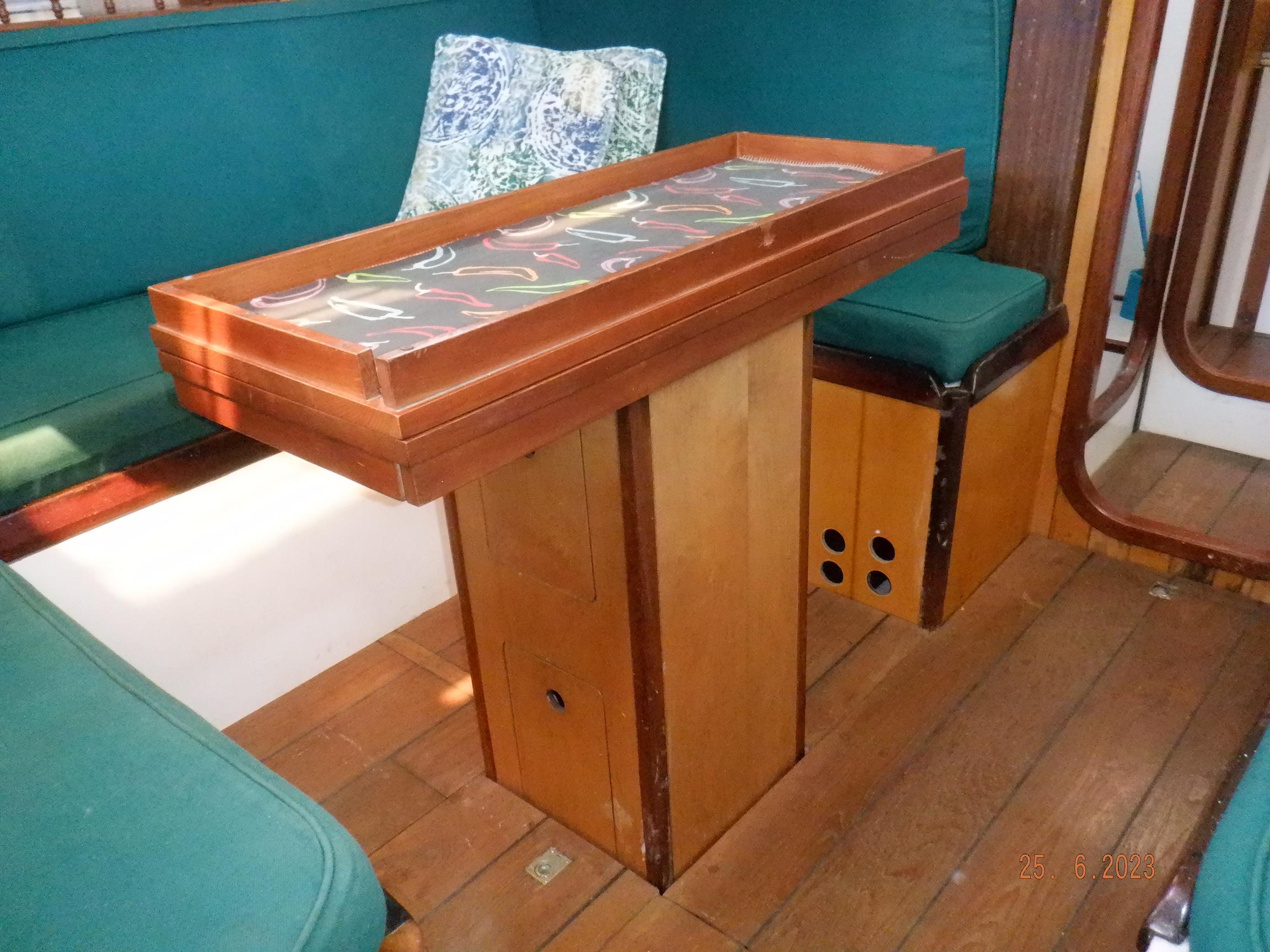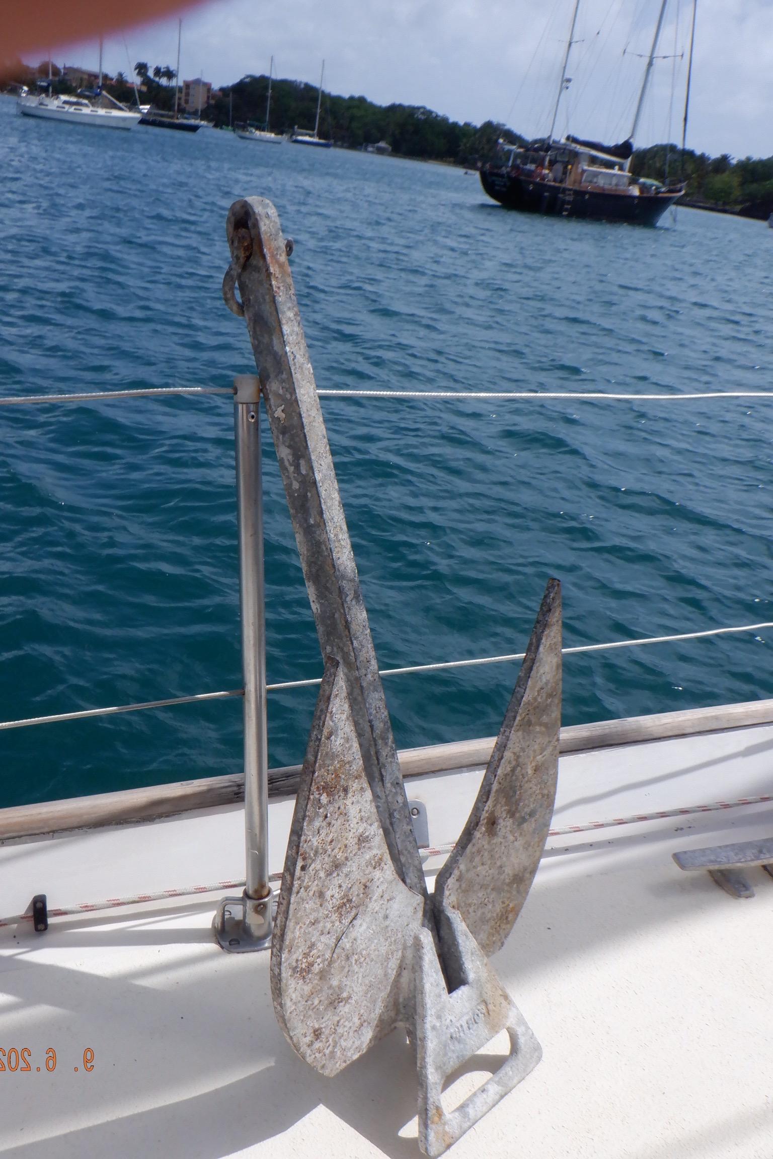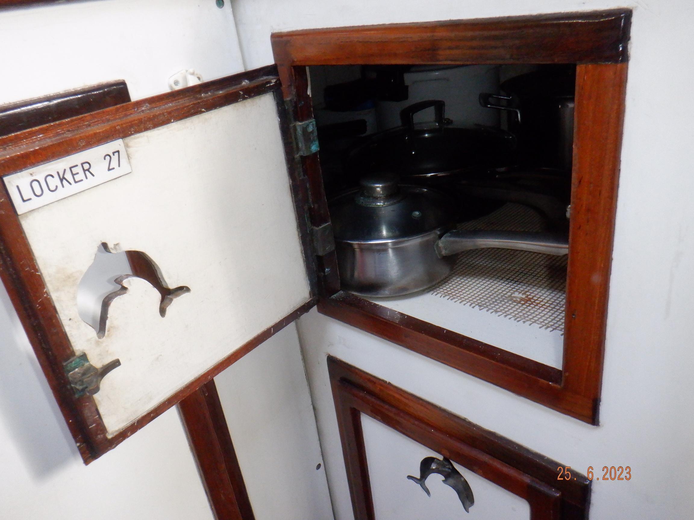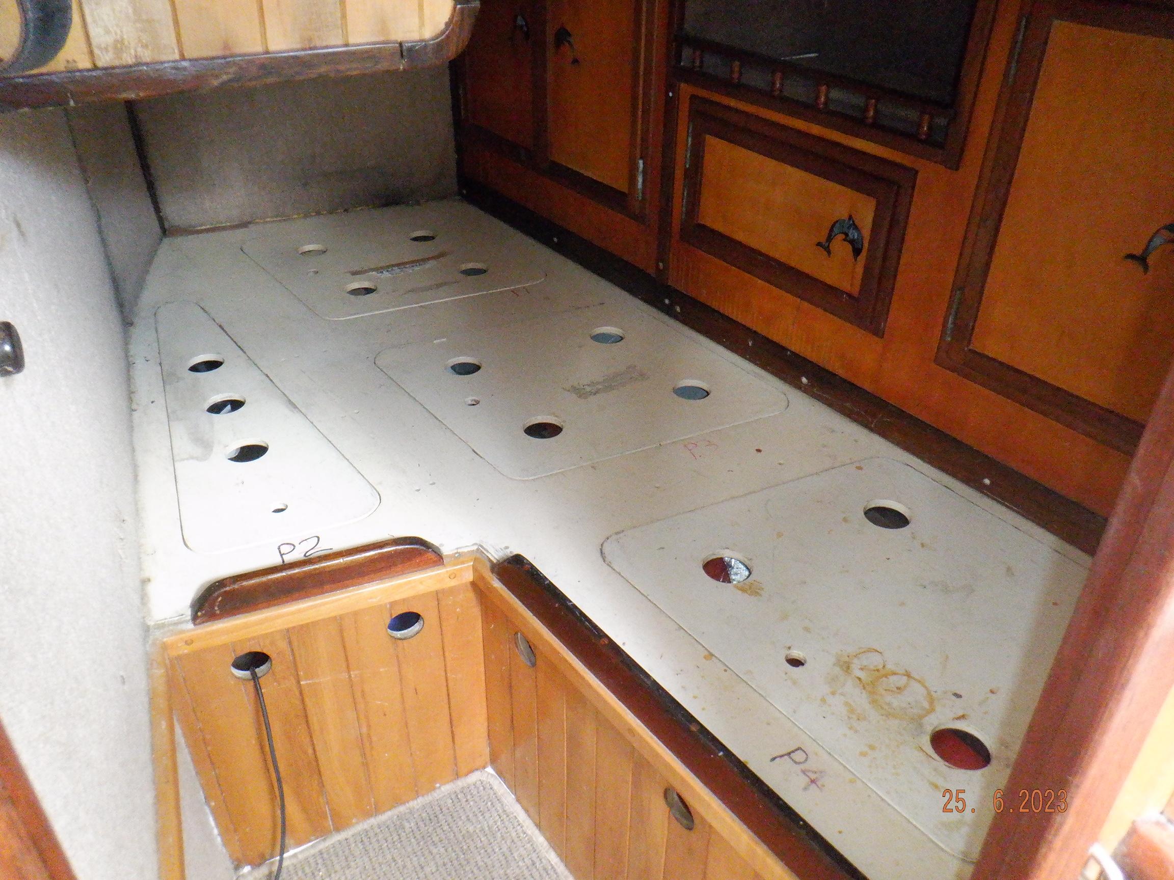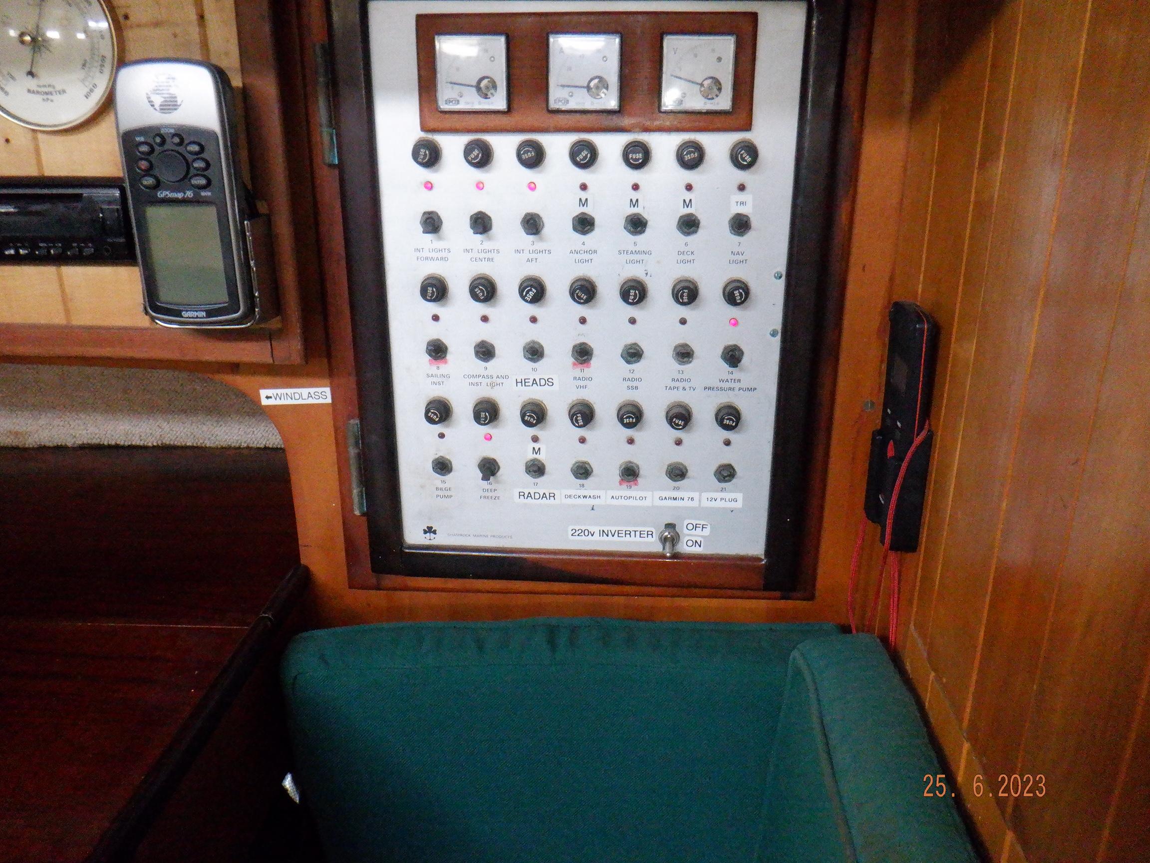 Equipment List Rig/Sails Sparcraft mast and boom, twin spreader. Cutter rigged with masthead staysail. Mast steps up to lower spreaders then a single pair at mast head to provide stability when working at masthead. Removable running backstays Twin backstays 3 forestays. Main forestay to bowsprit end with Profurl furler for genoa. Masthead. Inner forestay to bowsprit base for hank-on staysail. Masthead, making for a well secured mast. Highfield Quick release lever at base. Inner inner forestay to upper spreaders for storm jib. Also Highfield quick release lever at base. Bellamy kicker. Traveller 6 halyards with double purchace main halyard. Grannybar on starboard, with goody-bag designed for easy storage of winchhandle, sail ties, short lines etc. Spinaker pole, plus jockeypole. Ullman stackpack with adjustable lazyjacks. North fully battened mainsail with two reefs Ullman 110% genoa. North heavyduty #3 hank-on staysail, with 4 battens. (my favoured sail when on passage) Quantum reaching gennaker (good condition but colour has run) Storm trysail plus storm jib All sails in good working order. WINCHES IN COCKPIT Lewmar 56st primaries Lewmar 46st secondaries Portside cabintop:- Barlow 25 for toppinglift, reefing lines Starboard side cabintop:- Lewmar 46st for mainsheet, kicker, Cunningham ON MAST Port:- Lewmar 30st for staysail halyard, port spinaker halyard. Starboard :- Lewmar 30st for main halyard, genoa halyard, starboard spinaker halyard, stormjib halyard. Under boom:- for outhaul, plus can use for reefing lines, etc. ENGINE Yanmar 3JH40 common- rail diesel 40hp (hours currently 284hr June 2023) Installed late 2018 KM35 transmission, Vetus Bullflex coupling 30mm s/s propshaft. Fixed blade 17×13 propshaft TENDER/DINGHY ZODIAC 2.5m PVC inflatable (near the end of its life) Inflatable keel, grp over honeycomb floor panels MERCURY 5hp outboard with remote fueltank Paddles and pump, anchor and rode ELECTRONICS (all installed 2016/7) AT NAVSTATION Raymarine eS97 chartplotter/MFD Raymarine Ray60 vhf radio with DSC AIS 650 transceiver Raymarine ACU200 autopilot control (Robertson HLD2000 Mk2L hydraulic ram at rudder quadrant) Garmin GPSmap76 handheld (old & never used, but working. Uniden Atlantis250 handheld VHF (old and battery failing) IN COCKPIT Raymarine eS75 chartplotter/MFD Raymarine P70 autopilot control Raymarine i60 wind instrument Raymarine i70 multipurpose instrument Raymic VHF handheld plus active speaker ON MAST Raymarine Quantum radar ELECTRICS Eclectic Energy D400 wind generator with Xantrex charge/load controller 300w solar panel with Victron MPPT 100/15 controller Xantrex battery monitor 2 off Lifeline AGM GPL-8DL 255ah house batteries 1off xStream Power MF115D31R 85ah cranking amps 830amps engine start battery. Victron blue-smart 30a battery charger Victron Phoenix 12/800 inverter Four electric bilge-pumps in bilge, for quick clearance of water. One extra large manual bilgepump in saloon area. WINDLASS/GROUNDTACKLE Maxwell RC10/10 1200w 12v vertical axis, with capstan. Maxwell Autoachor 710/6 cordless remote control. Secondary Up/Down control box out of forecabin(thru hatch). Keeps switching equipment away from damp environments except when in use. VULCAN 20kg galvanized anchor FOB HP 20kg galvanized backup anchor CHAIN/RODE:- (connected) 70m of 10mm galvanized chain (backup) 30m of 10mm galvanised chain plus 50m of rode. Stored underforepeak bunk in separate locker, with tubular feed up into anchor locker on deck, connected permanently for quick access. ON DECK 2 dorades ahead of traveller feeding fresh air to galley and starboard aft cabin. Teak mounting brackets for boathook/paddles/oars/battens/etc. Sampsonpost with s/steel plate atop, useful when cutting/drilling etc. Ample cleats, fairleads, clutches etc. Pressurised seawater deckwash outlet on portside deck. Various fenders, docklines. 2x 25liter diesel jugs. 1x 10liter petrol jug. GALLEY Force 10 2burner stove with oven/grille. Adjustable Potholder brackets, Gimballed. Replaced Jan 2020. Ample pots, pans, baking/roasting trays, pressure cooker, s/steel kettle. Full range of chefs equipment, knives, ladles, tongs, graters, etc etc etc. Six-piece cutlery (s/steel) crockery (melaware), mugs and glasses, with spares of certain items. Ample airtight containers for in-use ingredients, plus food storage. Double sink, fed by pressurised cold fresh water, footpumped drinking water, and footpumped seawater. HEADS Vaillant gas waterheater to handbasin, never used but tested from time to time. JABSCO compact electric toilet Pressurised hot/cold water to handbasin. Handshower incorporated into tap unit. SAFETY EQUIPMENT Viking 4man cassette liferaft, mounted in quick release bracket on deck. MOB horseshoe life-ring with danbouy. 4 x PFDs 6 x life jackets Waterproof canister with flares, smoke signals, mirror, etc. 2 off 2.5kg drypowder fire extinguishers. 1 off 2.0kg CO2 fire extinguisher. Rigging Shears (1/2 inch/ 12.7mm) capacity, brand new in box. Ullman sail repair kit MISCELLANEOUS Nikon 12×50 binoculars 2x goggles, 2x snorkels, 2x flippers Spareair 15min scuba tank 1 x scuba bottle (almost full, used to fill Spareair. 2 x sleeping bags Fitted sheets for all bunks, pillows and pillowslips 8 x scatter cushions for saloon Various bath towels, hand towels, beach towels, kitchen dish towels and hand towels. Gas braai/barbecue mounted on pushpit. Coldwater handshower in cockpit. Bosuns chair Rope climbing kit for solo mast climbing 12v air compressor 2 x boathooks Full set of handtools (all mounted) to carry out any repairs/service. Makita 18v cordless anglegrinder Makita 18v cordless 13mm drill Makita 18v cordless 10mm angledrill Makita 18v cordless orbital sander Makita 18v cordless jigsaw 220v/18v Makita charger 12v/18v Makita charger. 2off Makita 18v 5ahr batteries 1off Makita 18v 1.5ahr battery Makita18v cordless airblower Makita 18v cordless hand vacuum. Bench vice attached to workbench. Various spare belts, filters, nuts