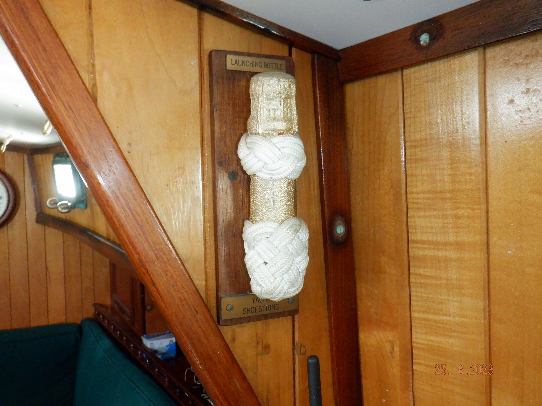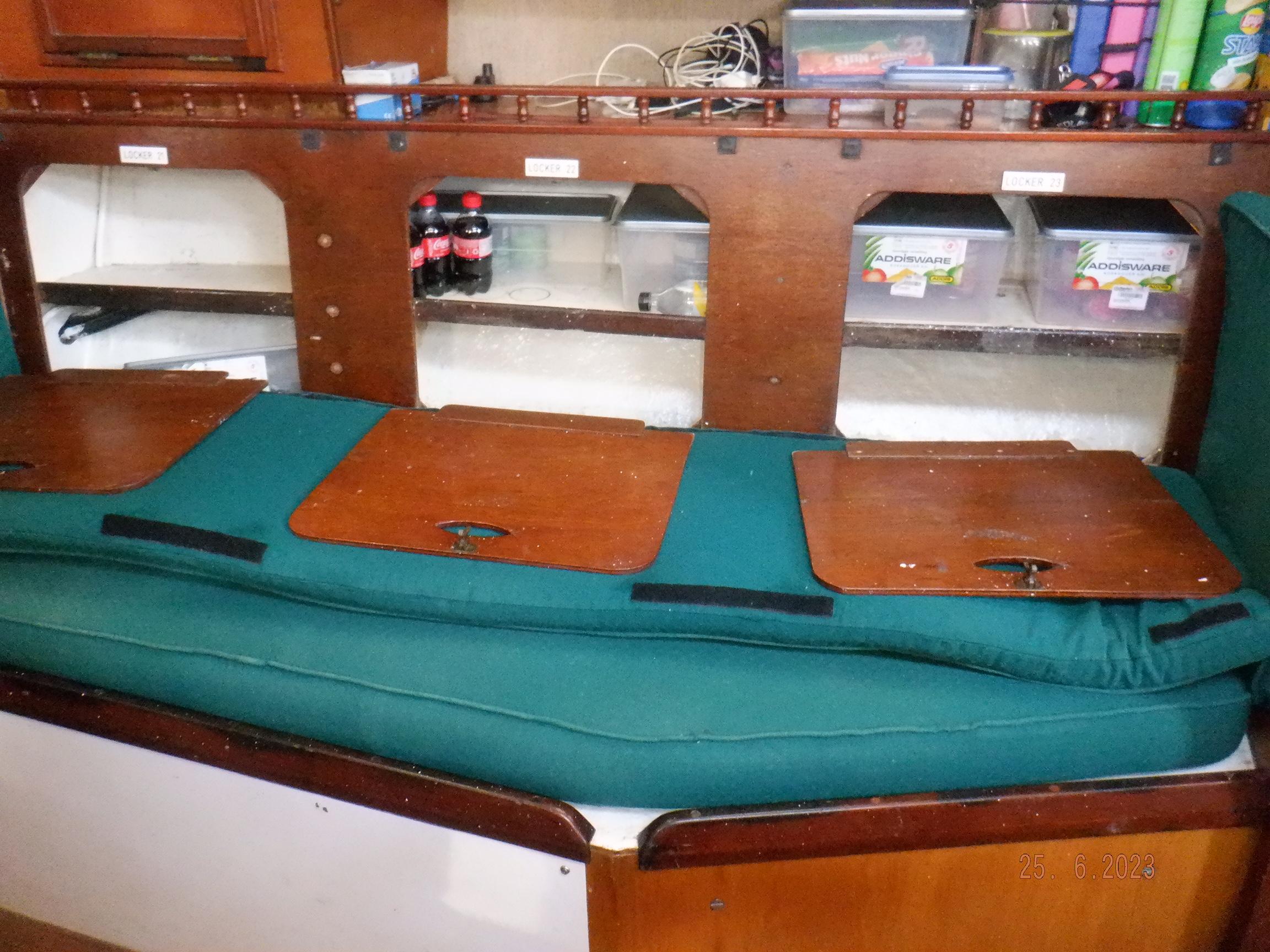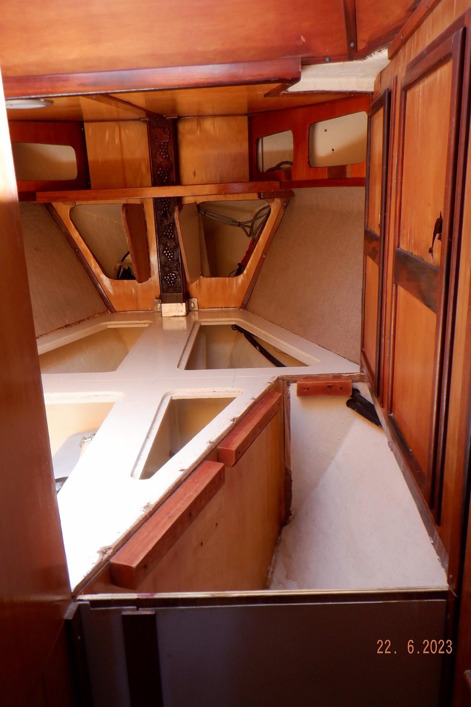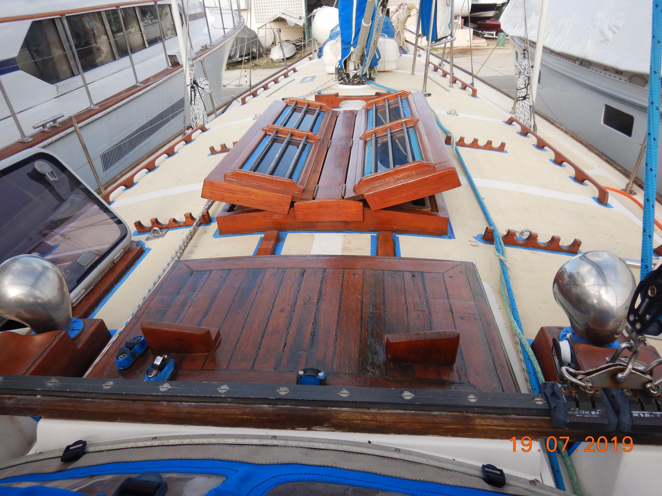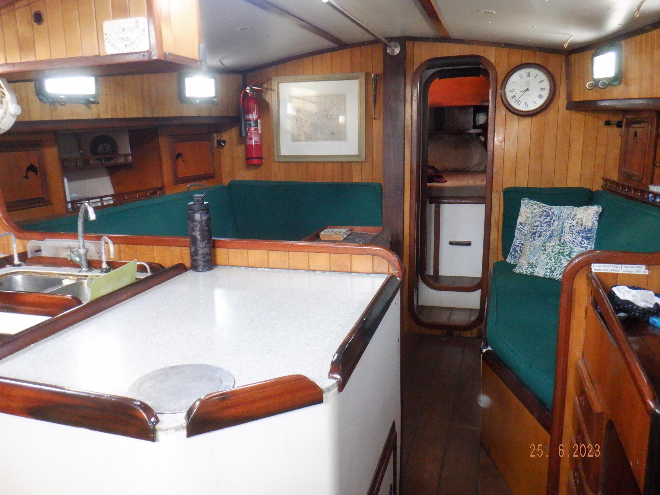 DESCRIPTION General Interior Shoestring has a 3 cabin layout with a single heads, as per the brochure. The forecabins pullman berth has been enlarged to cover the full floorspace, creating an extra sail locker, but this can quite easily be reversed. The starboard quarterberth is a full double, whilst the port quarterberth is a 3/4 cabin. The main saloon settees also make comfortable pilotberths. The bunks average 2meter long. The heads has an electric toilet, and a pressurised gas-heated shower. More than enough lockers, drawers, and cupboards to stow everything. Opposite the heads is a custom workshop, with workbench and vice, and custom tool storage. Foldable dining table in saloon. Saloon hatch is a 115x70cm (45x28inch) two-leaf butterfly hatch with tinted shatterproof glass. Cockpit and deck area Cockpit and cockpit sole lined with 22mm Burmese teak. After 20years is not even half worn yet. Edson pedestal (chain/cable steering to quadrant on rudder), 36inch s/steel leather covered wheel, foldaway table and removable cup/glass holders. Canvas dodger and bimini,. Transom-hung rudder with 4 s/steel steps on either side for boarding (always available in an emergency), emergency tiller permanently mounted on rudder, folded up out of the way. Winch positions and uses all listed in Equipment list. Clutches for all lines. Shoestring is a Category A craft for trans-ocean sailing and is fully equipped for this. There are on-deck teak racks for boathooks, oars, fishing rods, battens, etc.