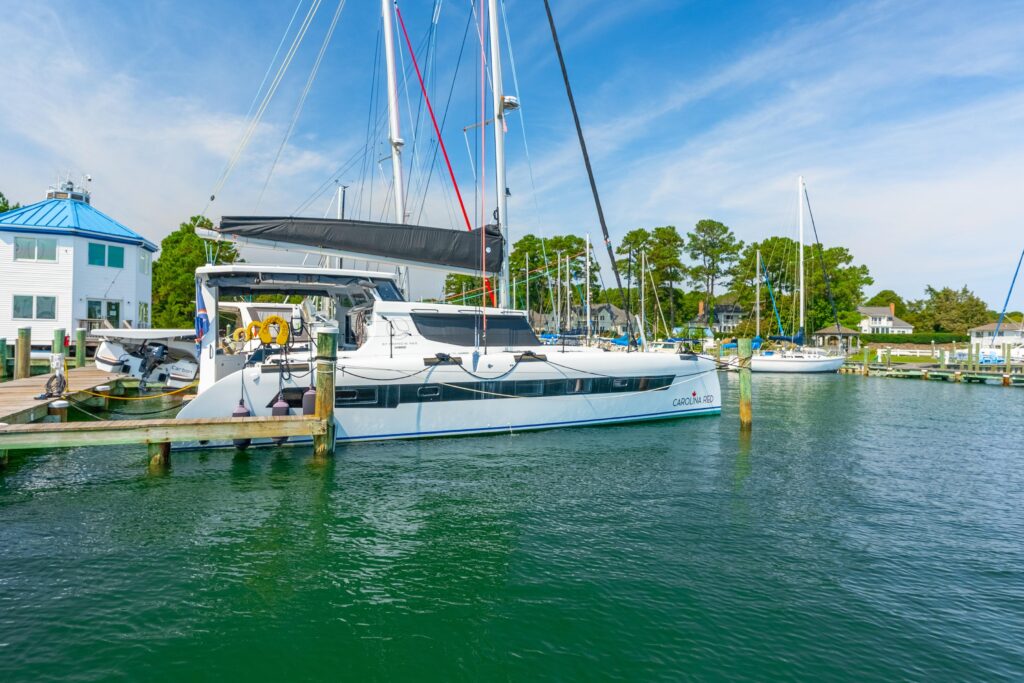 Carolina Red is a flagship example of this advanced design. Built for long-range efficiency, she features foam sandwich/marine ply construction with fully carbon-wrapped hulls. Her hybrid propulsion system combines twin 57-horsepower Yanmar diesel engines with 10kW electric motors, delivering performance with eco-conscious versatility.