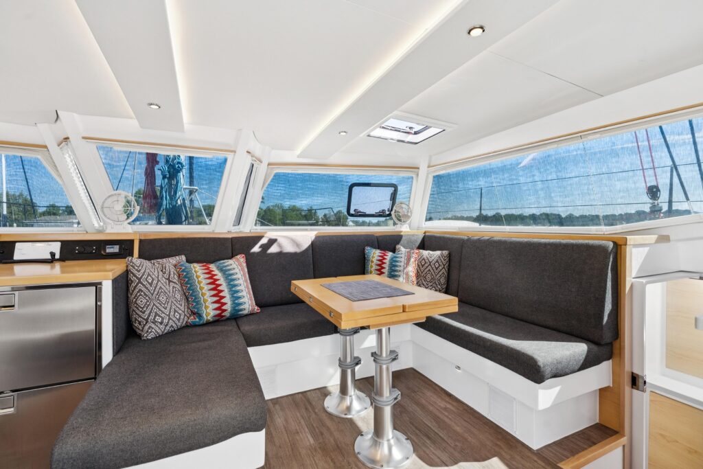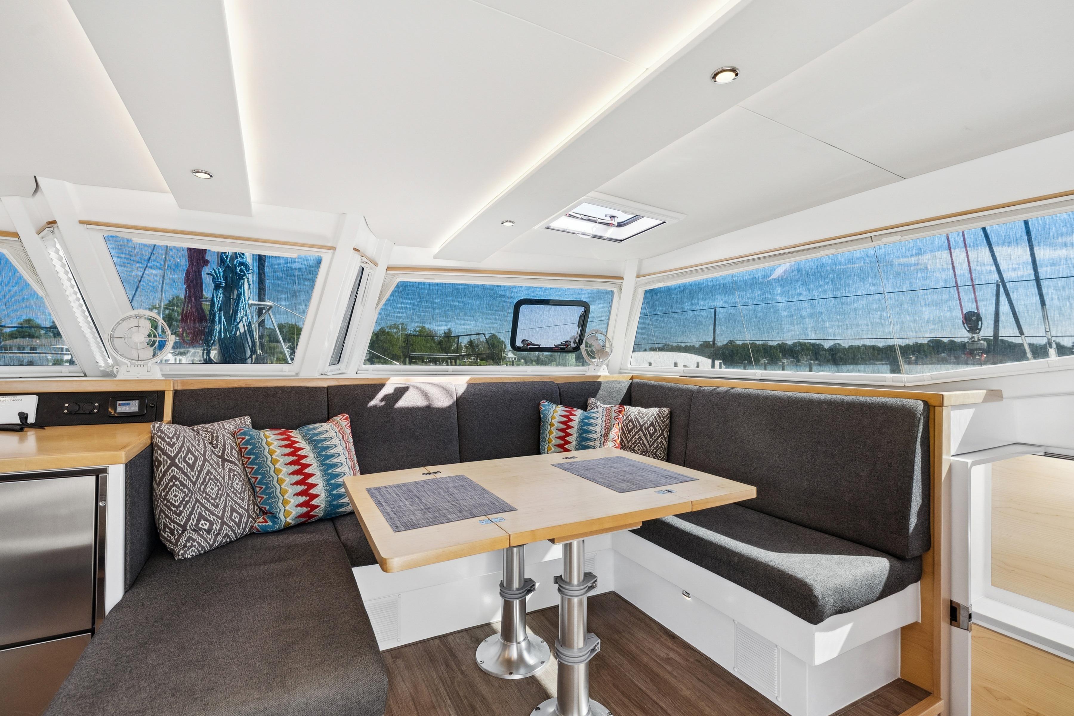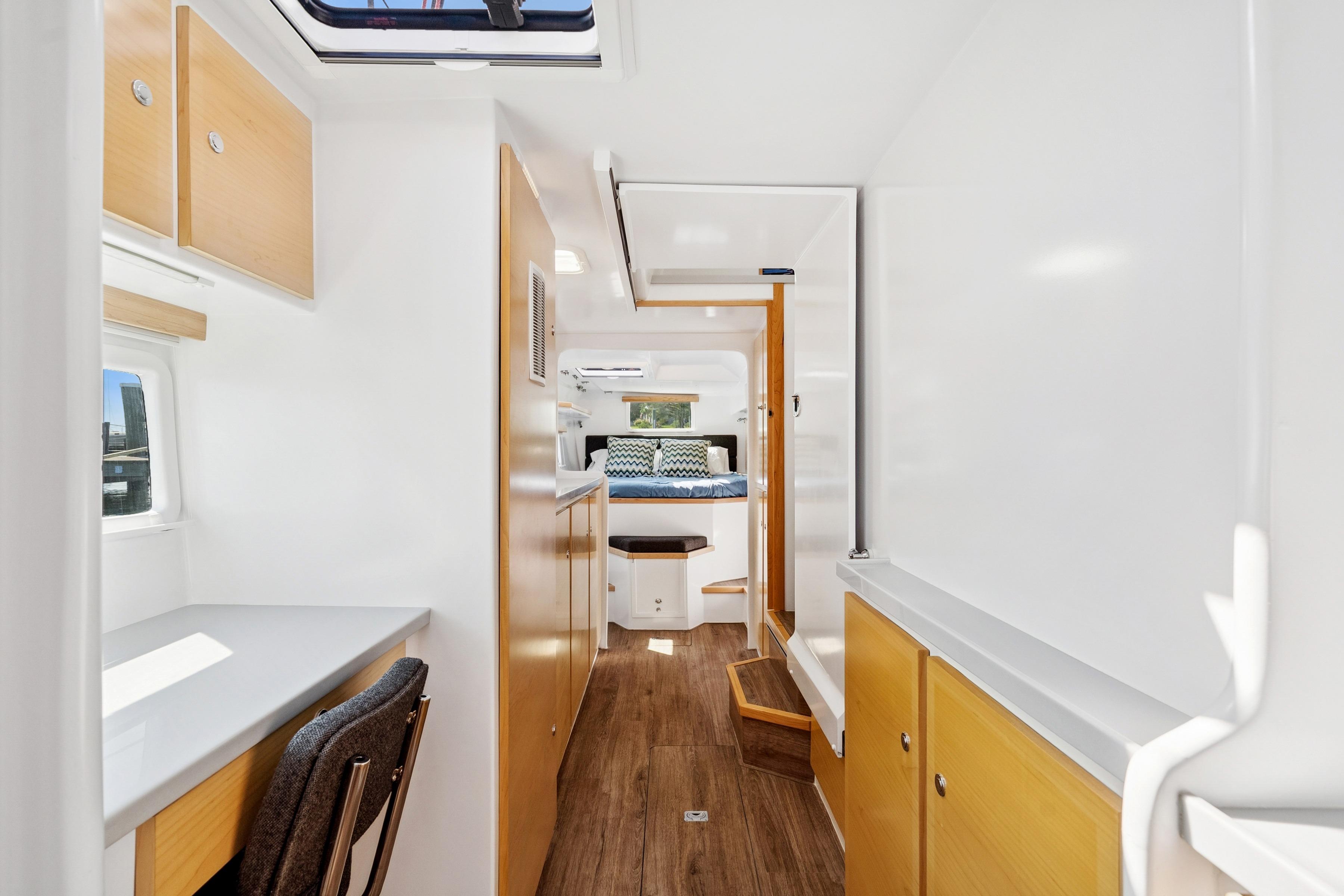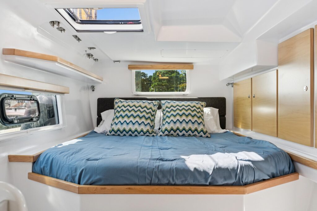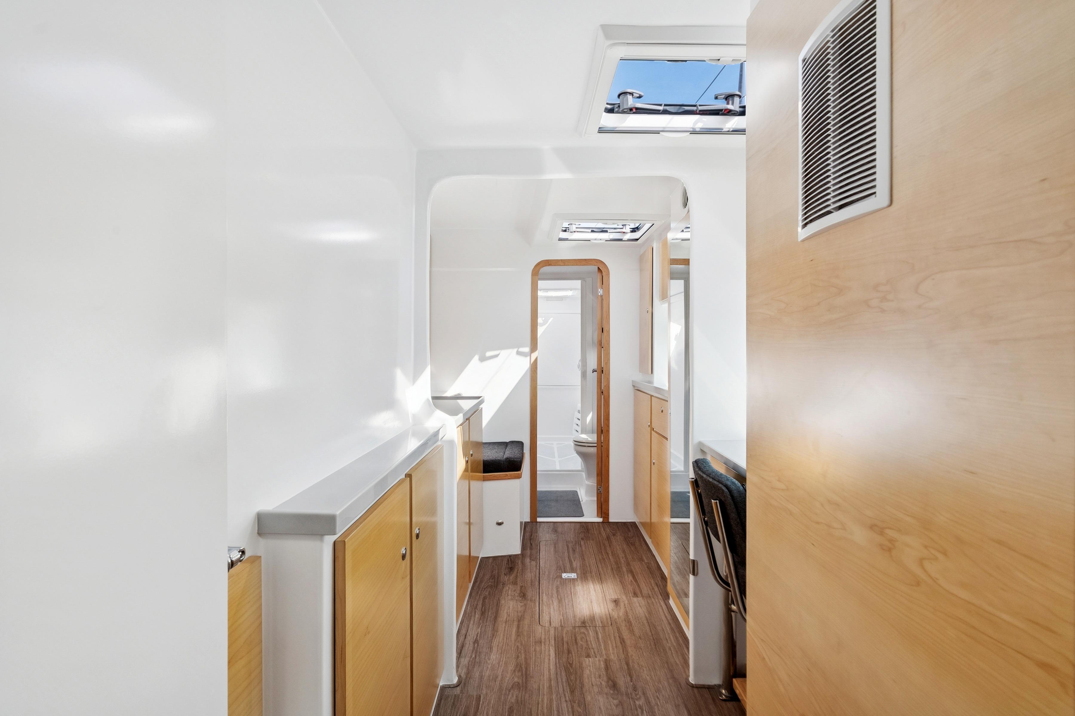 Twin 57hp Yanmar engines with 10kW electric motors for efficient, quiet cruising.