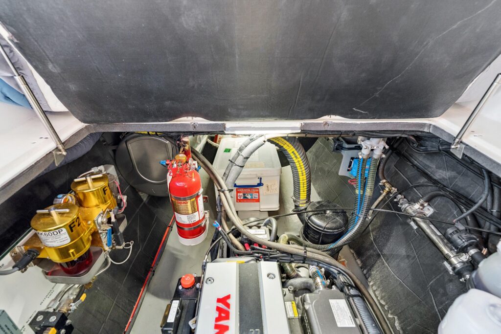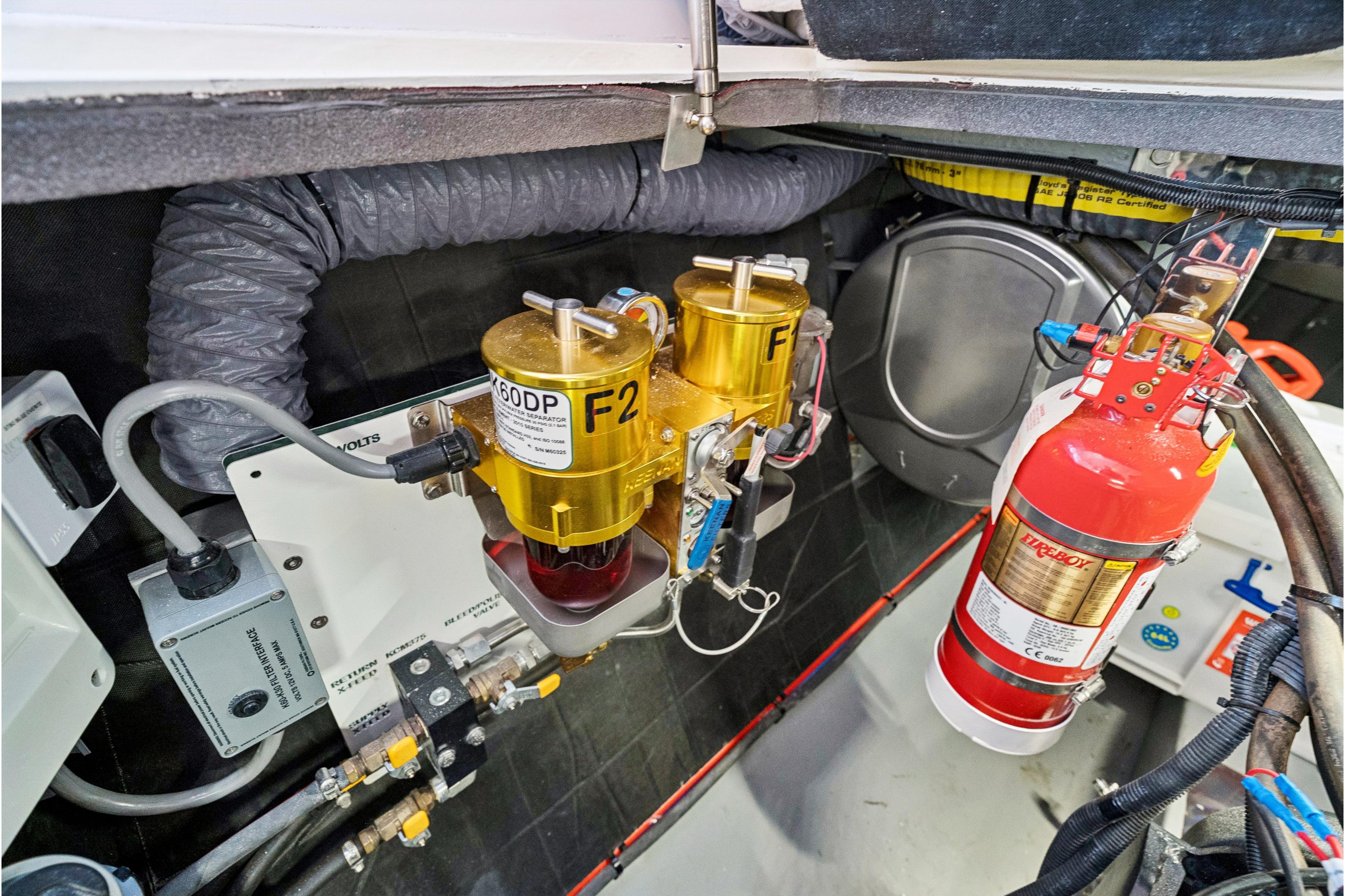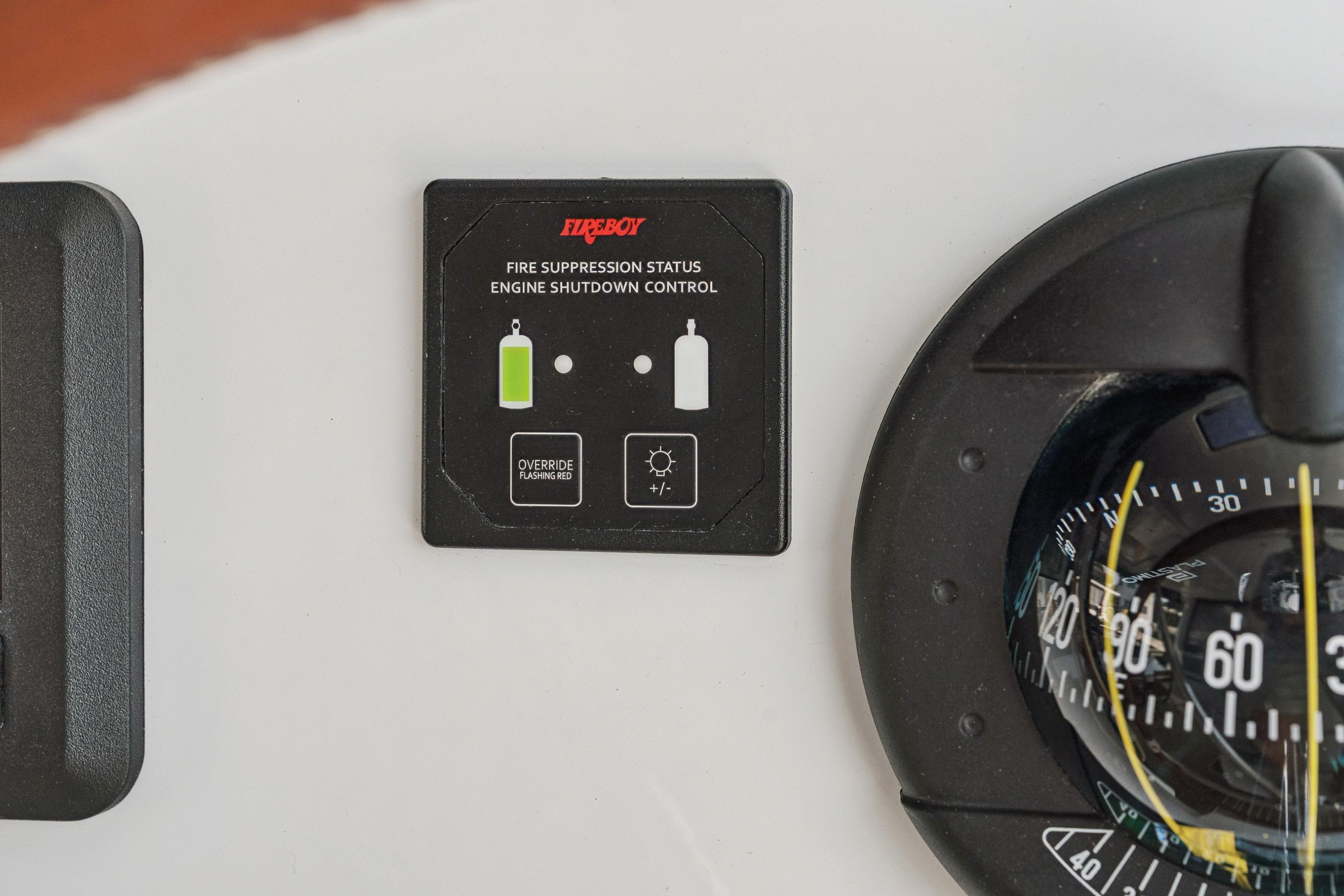 2 x Fireboy-Xintex #MA0450NVC automatic and manual gas-filled fire extinguishers – includes heat and smoke detectors, an engine shutdown system, and a helm station status panel with audible and visible alarms