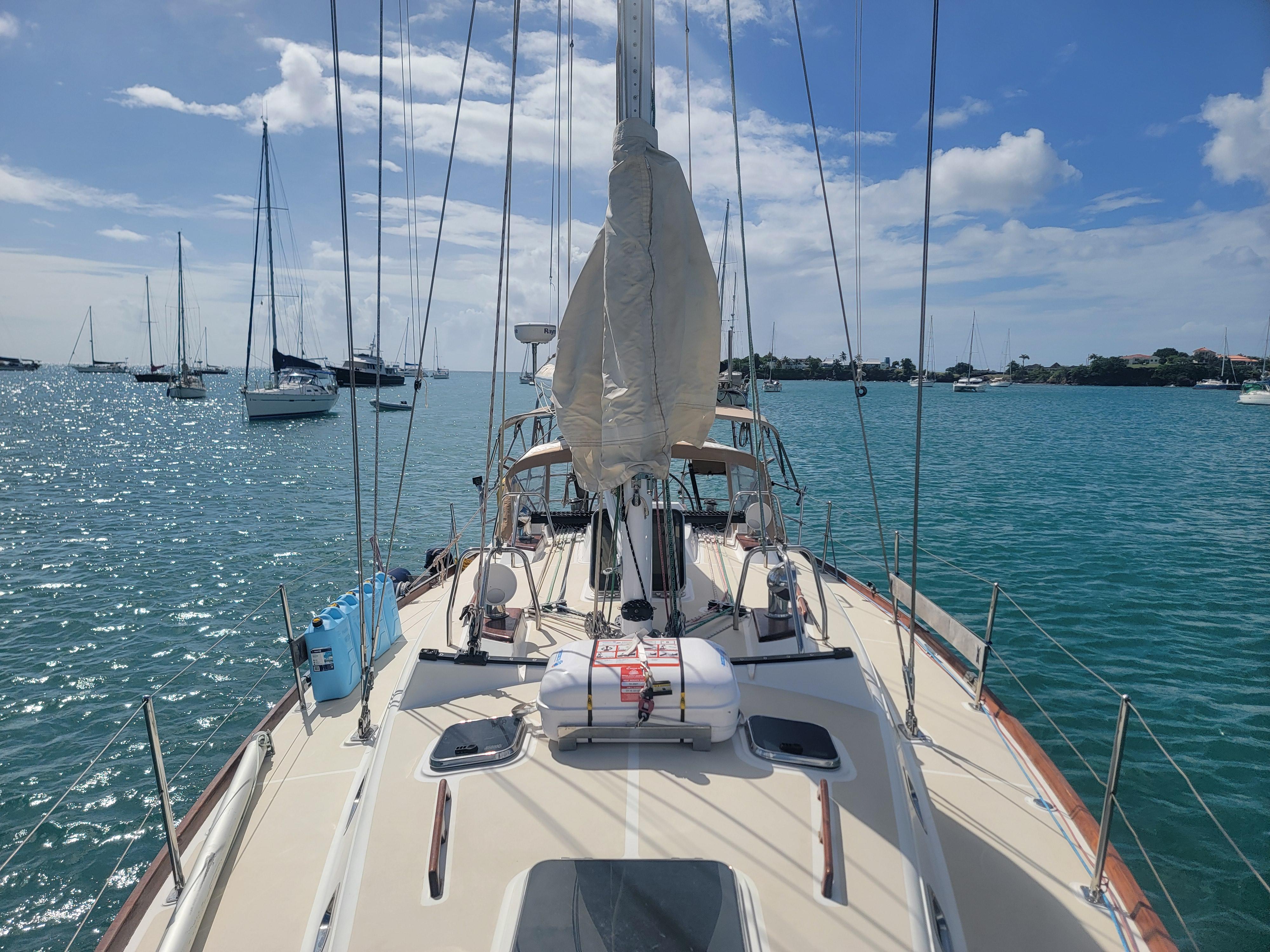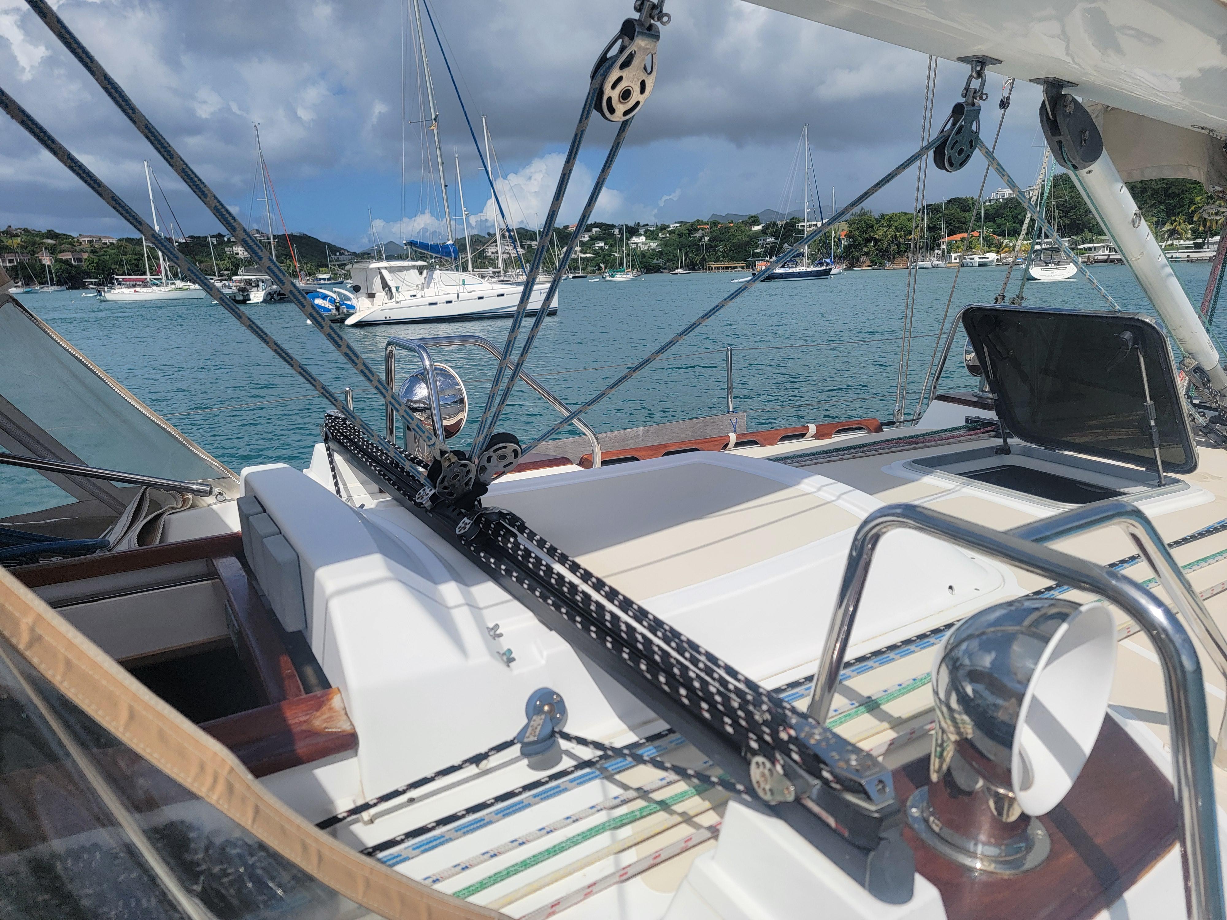 The streamlined low coach roof adds to the performance as well as classic lines that gets heads turning in any marina. The self-tacking jib makes cruising easy in addition to all lines leading back to the cockpit. The current and only owner sailed her around the world mostly single-handed. The decks are uncluttered with a deep, secure cockpit area.