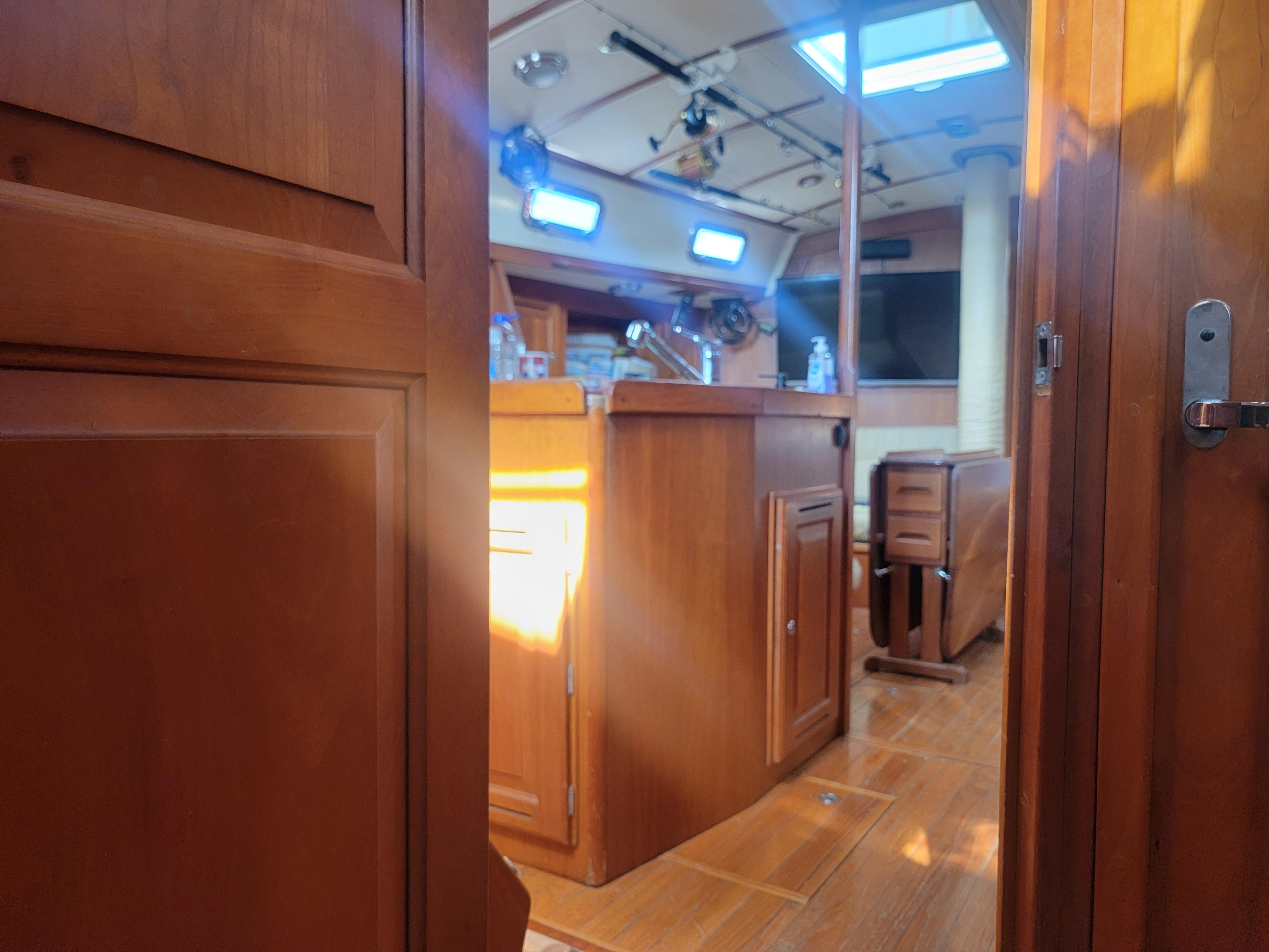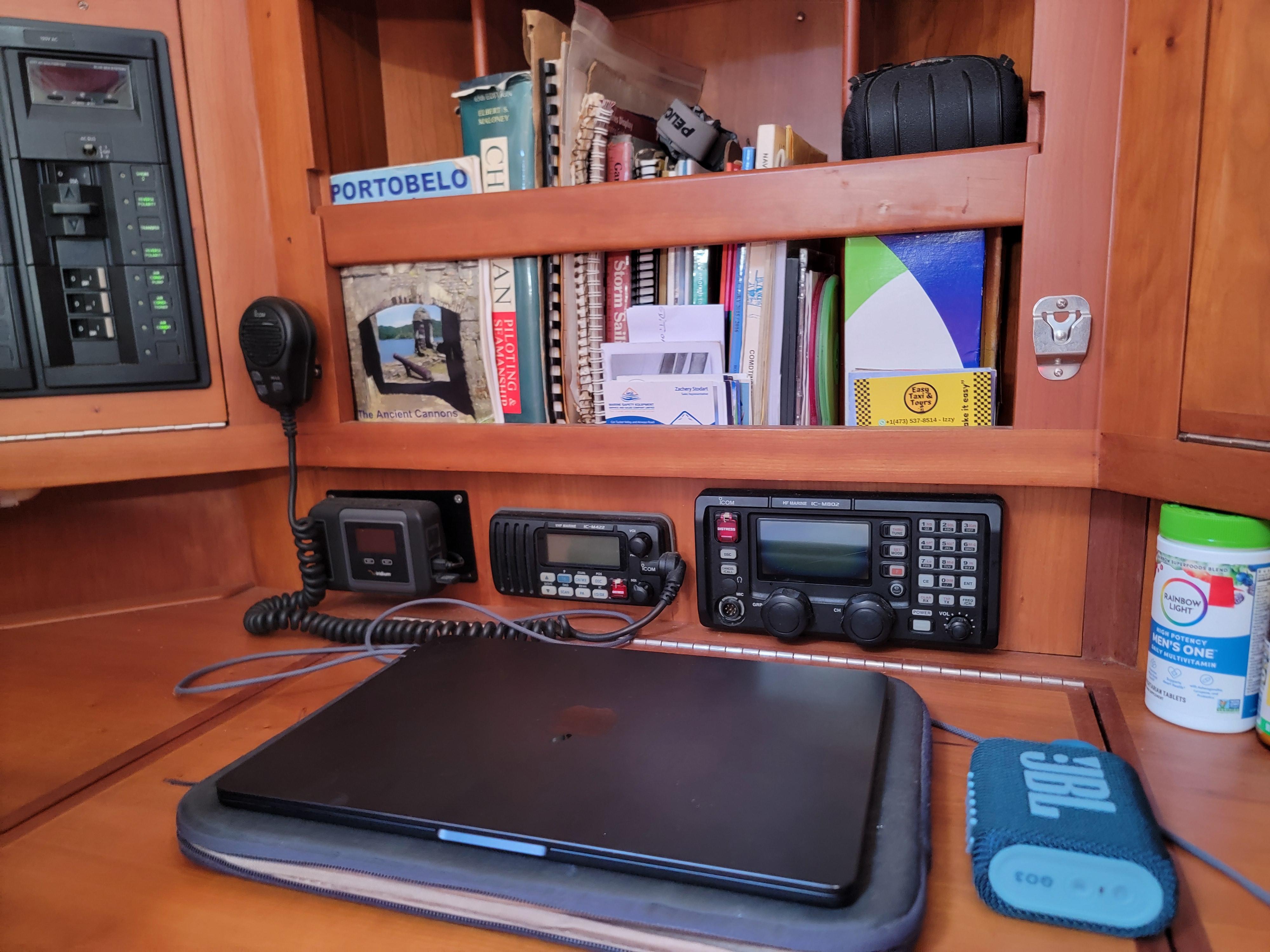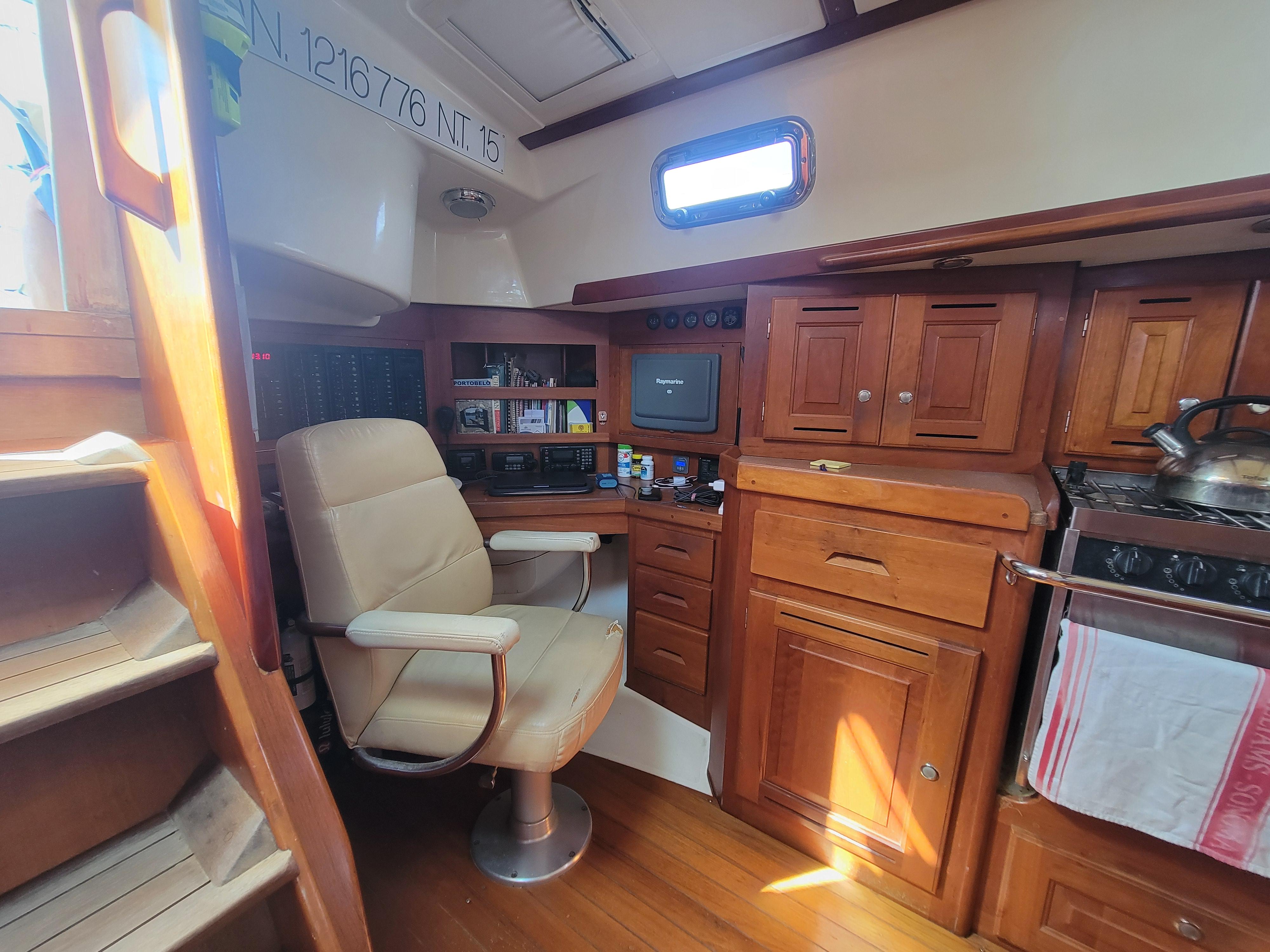 When I first stepped on board Rio I was impressed. The interior cabin area is very spacious for a 43 boat. Aside from the amazing rum collection, my first thought was elegant. It was like you go below and Ahh! a great escape for the crazy world outside. The navigation station is tucked into the corner with a comfy adult-size chair. (Most boats have a tiny stool that swings out.) This would make a great office space as its out of the way of traffic.