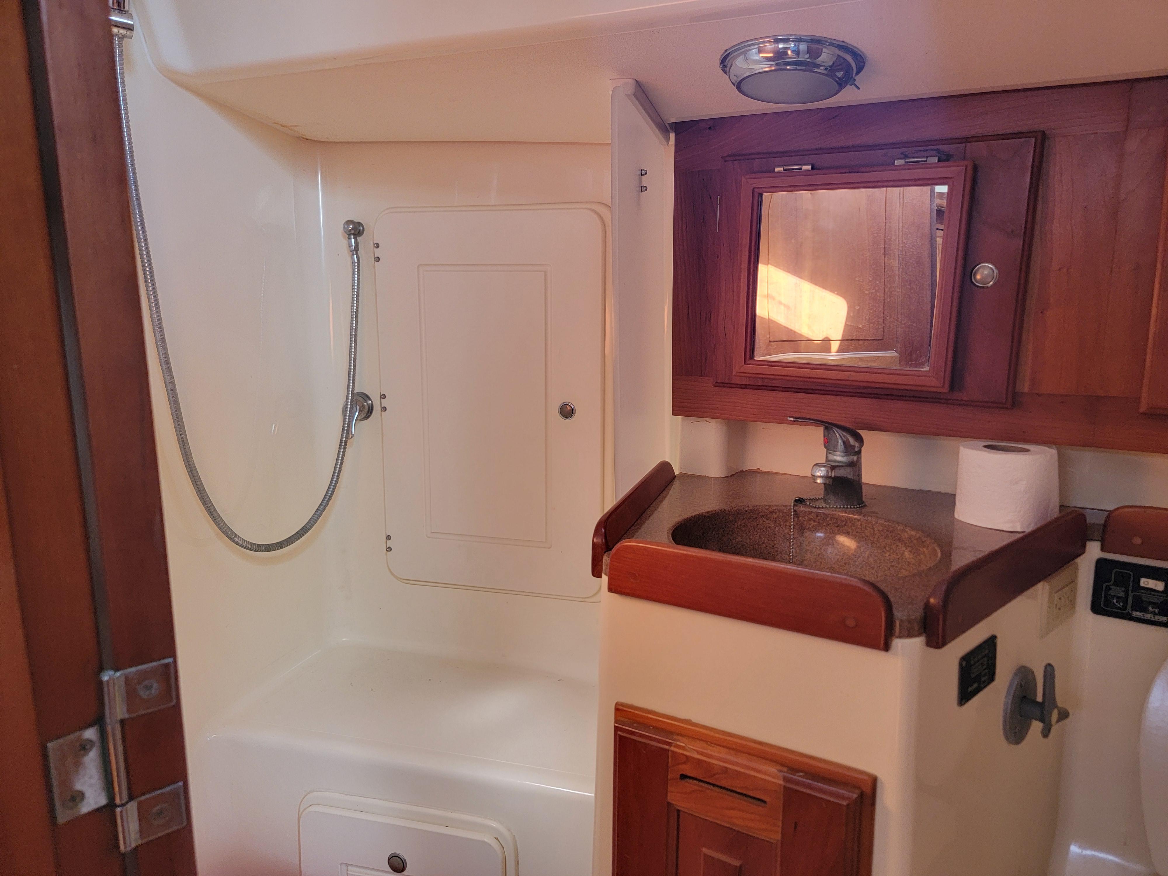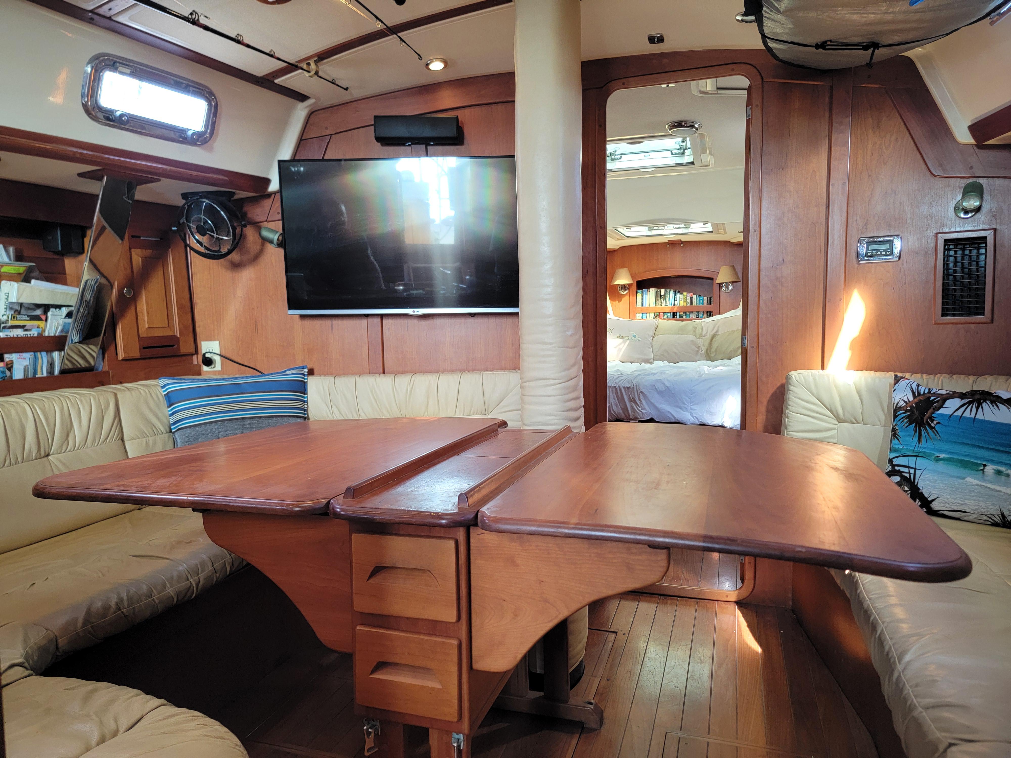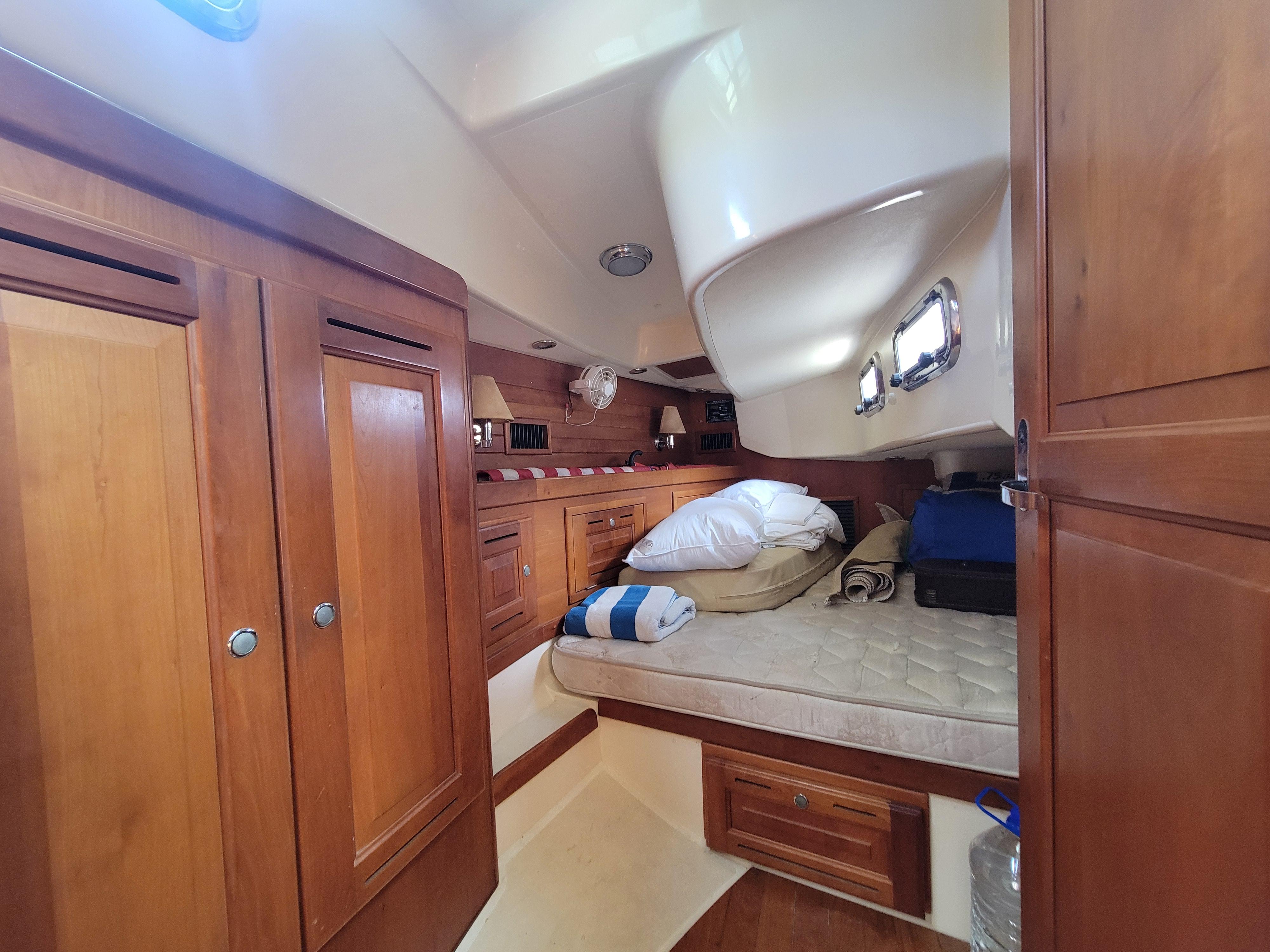 Each cabin has its own electric fresh water head which eliminates odors! The forward owners cabin has a semi-island style queen bed, and a flat screen tv with Bose speakers. There is a seating area and hanging lockers. The aft cabin has a double bed with lots of storage space.