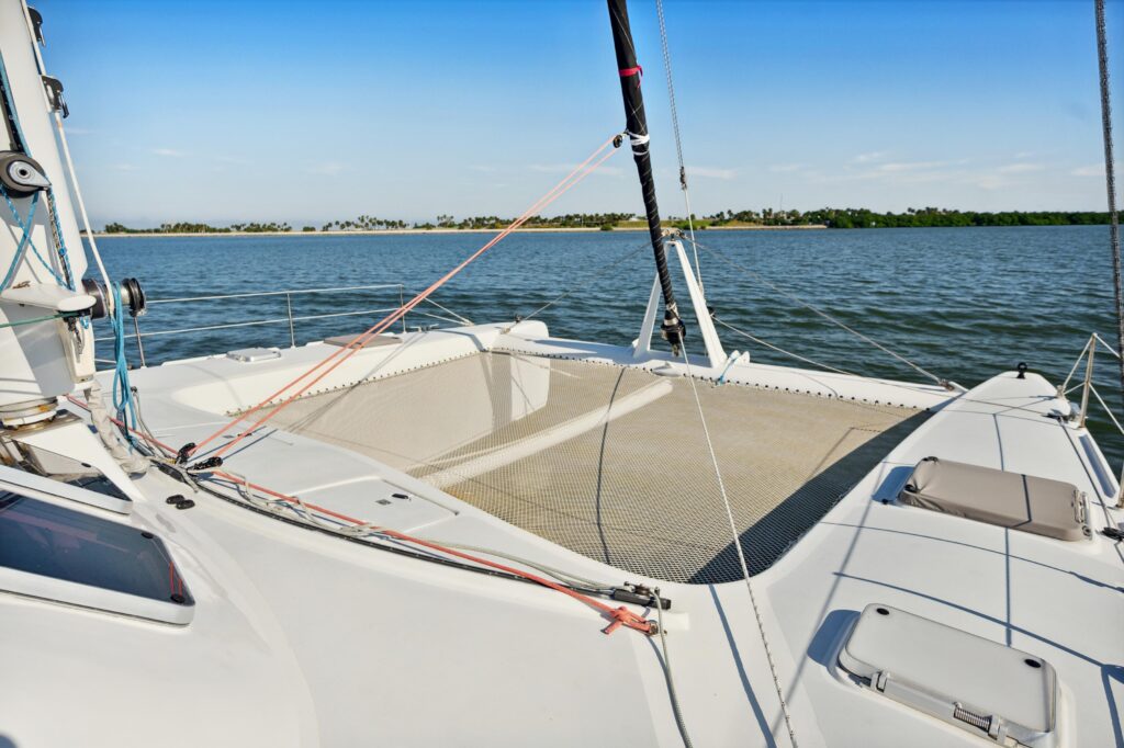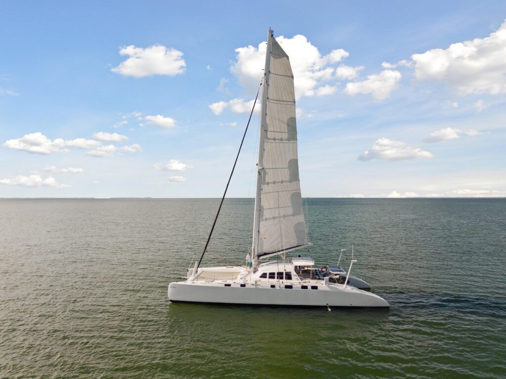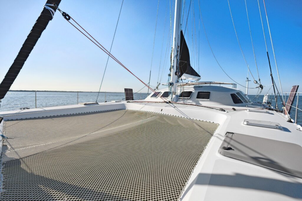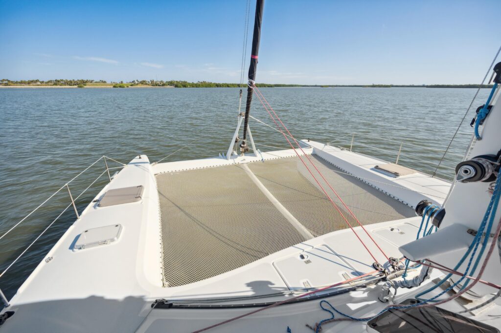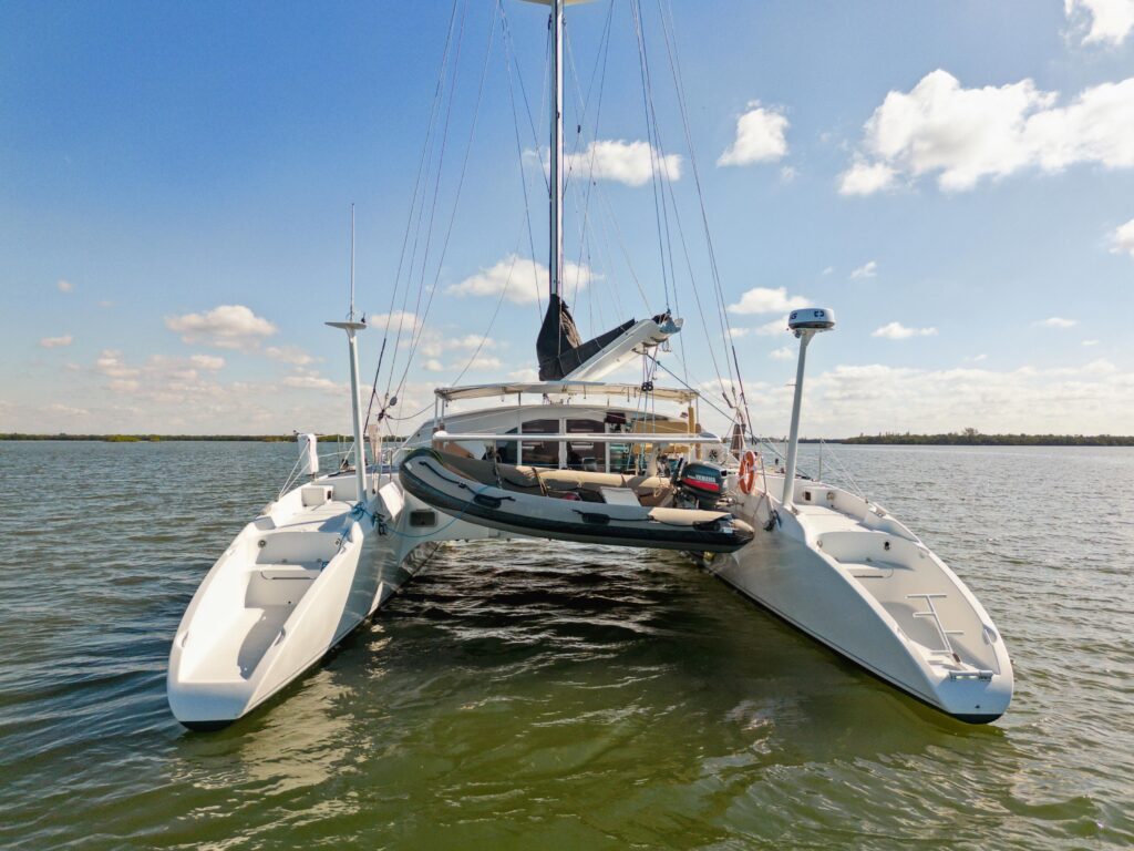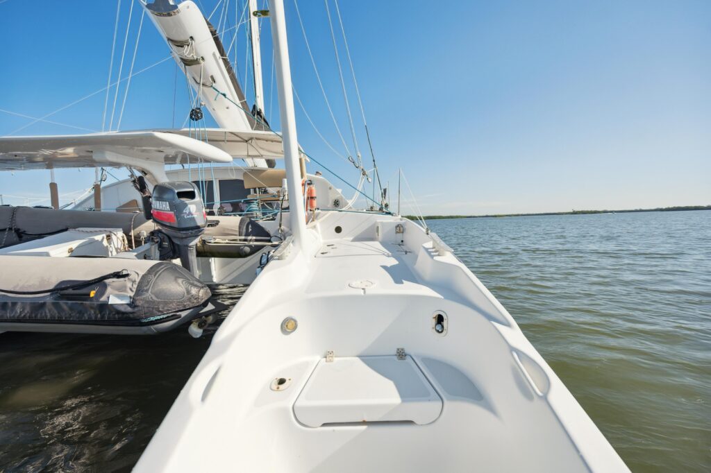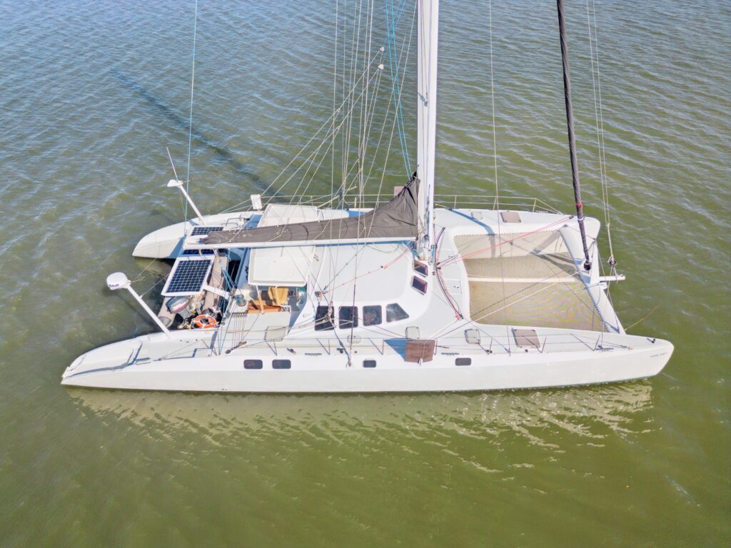 How many cabins: 4 How many can she sleep: 8 + Interior finish: Faired and painted, no liners Salon couch and fabric: Ultraleather Head and showers: 2 heads with showers each + 2 outdoor stern showers Hanging lockers: Yes Navigation station: Yes, forward facing and very large Interior lighting: LED The main salon is accessed via a wide, sliding doorway. The interior is a faired and painted finish throughout clean and light. No frills, no liners to hide mold and unnecessary embellishments on this performance cat. A dining table that can accommodate 5-6 guests dominates to port with a generous wraparound ultra-leather settee. Four large, opening hatches forward provide good ventilation through the salon and 4 windows to each side bring in ample light. A large, forward-facing chart table that doubles as a desk is set to starboard. Mounted on the chart table are nav instruments, Raymarine autopilot, Standard Horizon VHF radio, AIS and a Fusion stereo. An Iridium Go Satphone and EPIRB complement the safety equipment. A lithium-ion battery pack is situated under the main salon settee. The galley is down to port and features large countertops, a 3-burner stove, oven, updated fridge and freezer and ample storage. There is an additional fridge/freezer in the salon. The forward cabins feature double size berths and cabinets. Portholes on the topsides provide abundant natural light. The large aft cabins have impressive headroom with queen size beds athwartships. There is one head with shower in each hull.