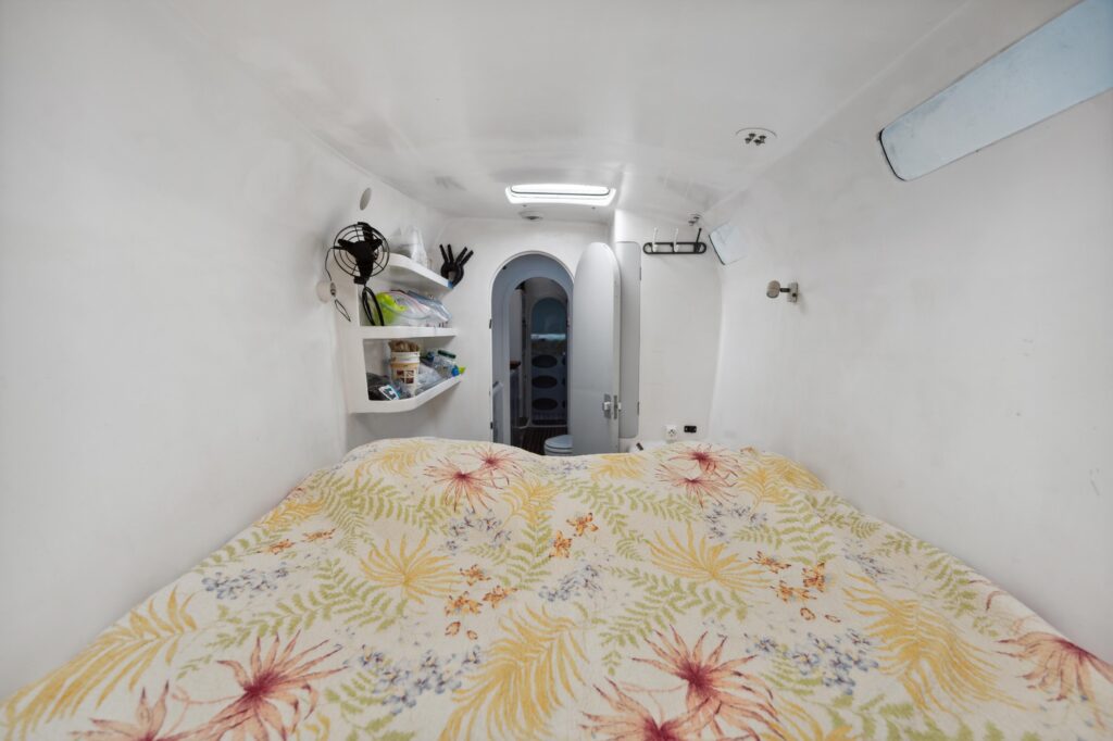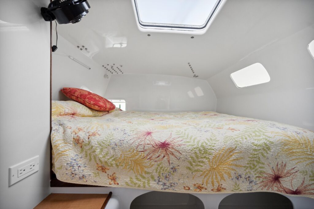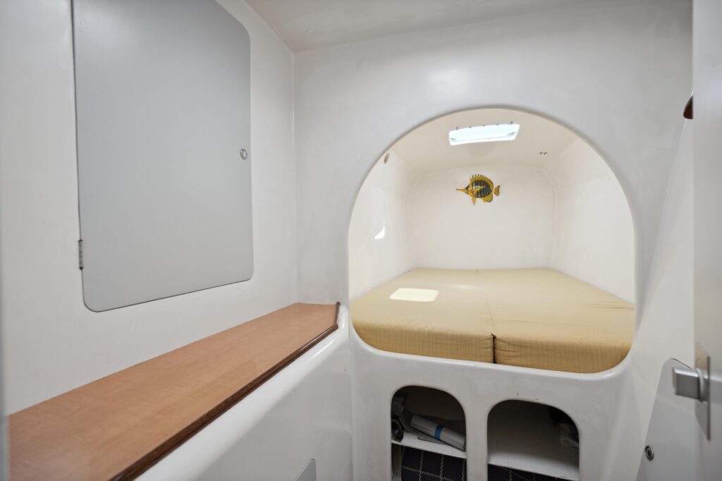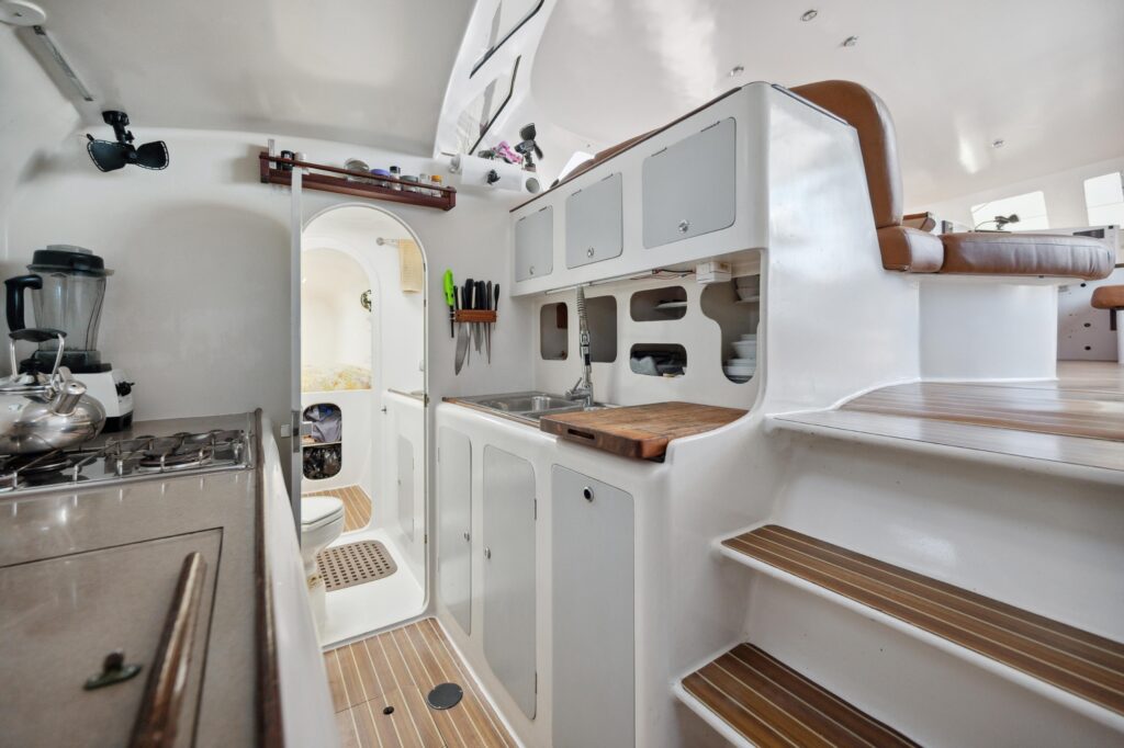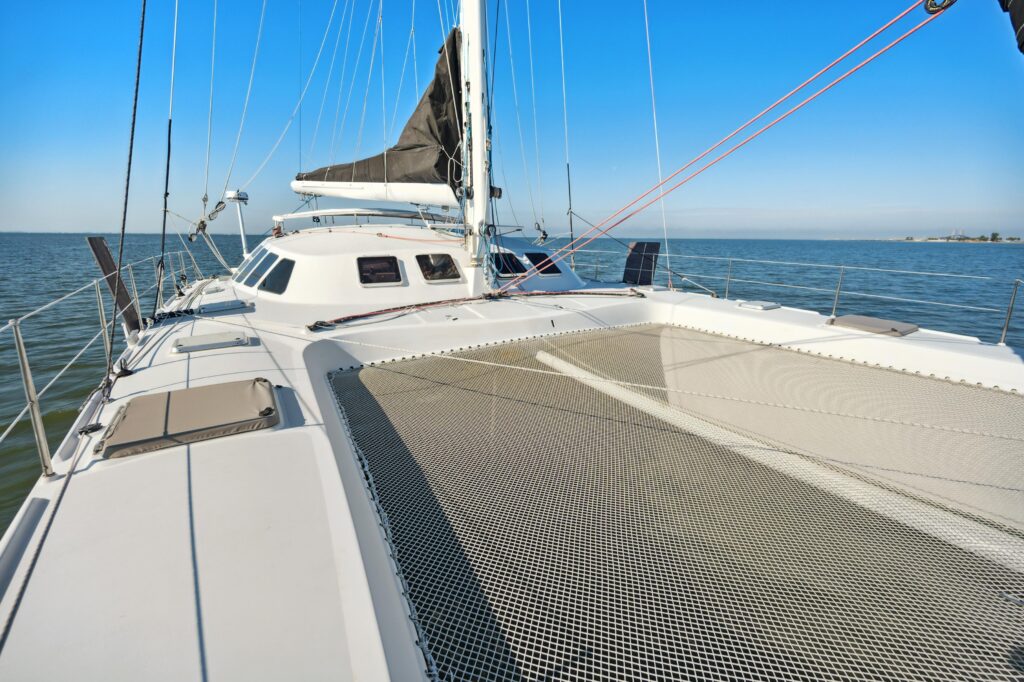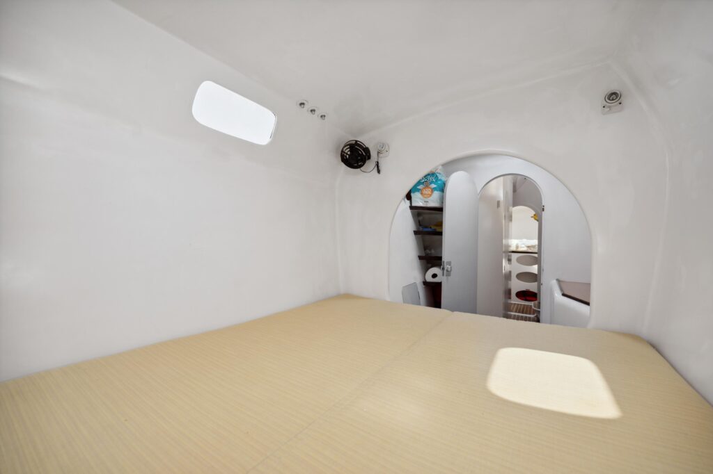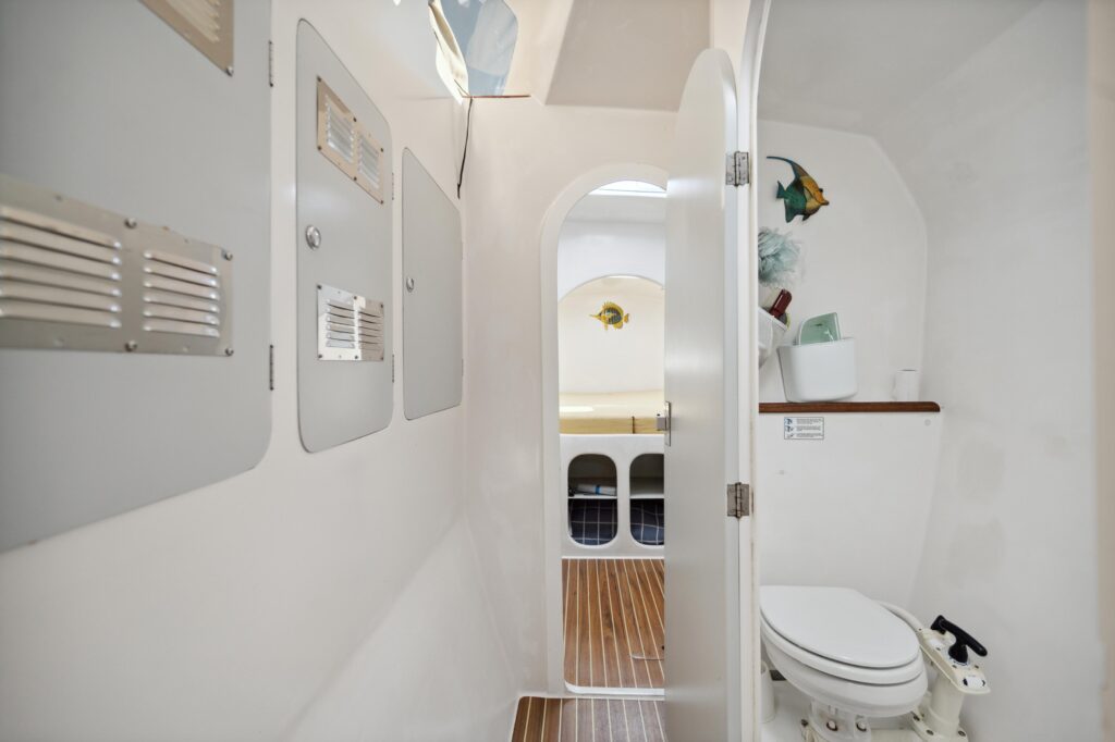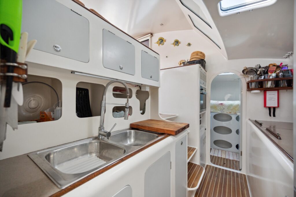 How many cabins: 4 How many can she sleep: 8 + Interior finish: Faired and painted, no liners Salon couch and fabric: Ultraleather Head and showers: 2 heads with showers each + 2 outdoor stern showers Hanging lockers: Yes Navigation station: Yes, forward facing and very large Interior lighting: LED The main salon is accessed via a wide, sliding doorway. The interior is a faired and painted finish throughout clean and light. No frills, no liners to hide mold and unnecessary embellishments on this performance cat. A dining table that can accommodate 5-6 guests dominates to port with a generous wraparound ultra-leather settee. Four large, opening hatches forward provide good ventilation through the salon and 4 windows to each side bring in ample light. A large, forward-facing chart table that doubles as a desk is set to starboard. Mounted on the chart table are nav instruments, Raymarine autopilot, Standard Horizon VHF radio, AIS and a Fusion stereo. An Iridium Go Satphone and EPIRB complement the safety equipment. A lithium-ion battery pack is situated under the main salon settee. The galley is down to port and features large countertops, a 3-burner stove, oven, updated fridge and freezer and ample storage. There is an additional fridge/freezer in the salon. The forward cabins feature double size berths and cabinets. Portholes on the topsides provide abundant natural light. The large aft cabins have impressive headroom with queen size beds athwartships. There is one head with shower in each hull.