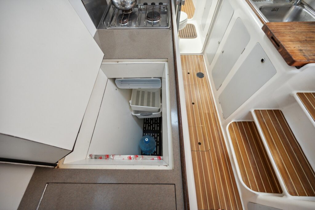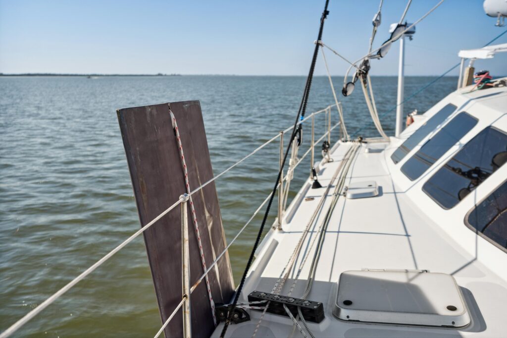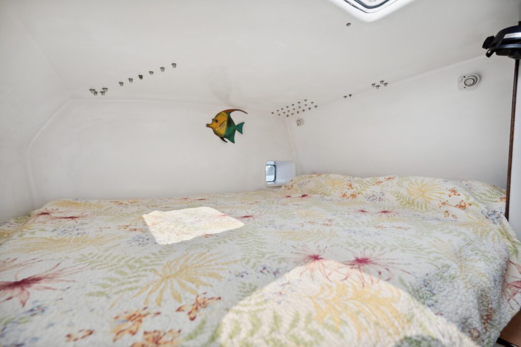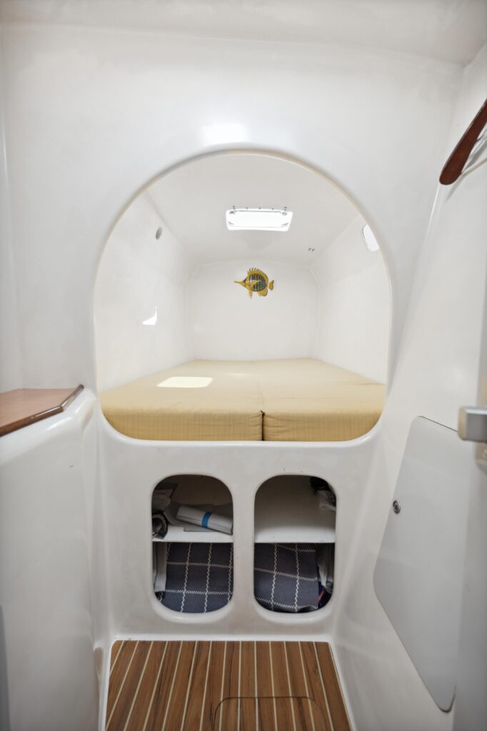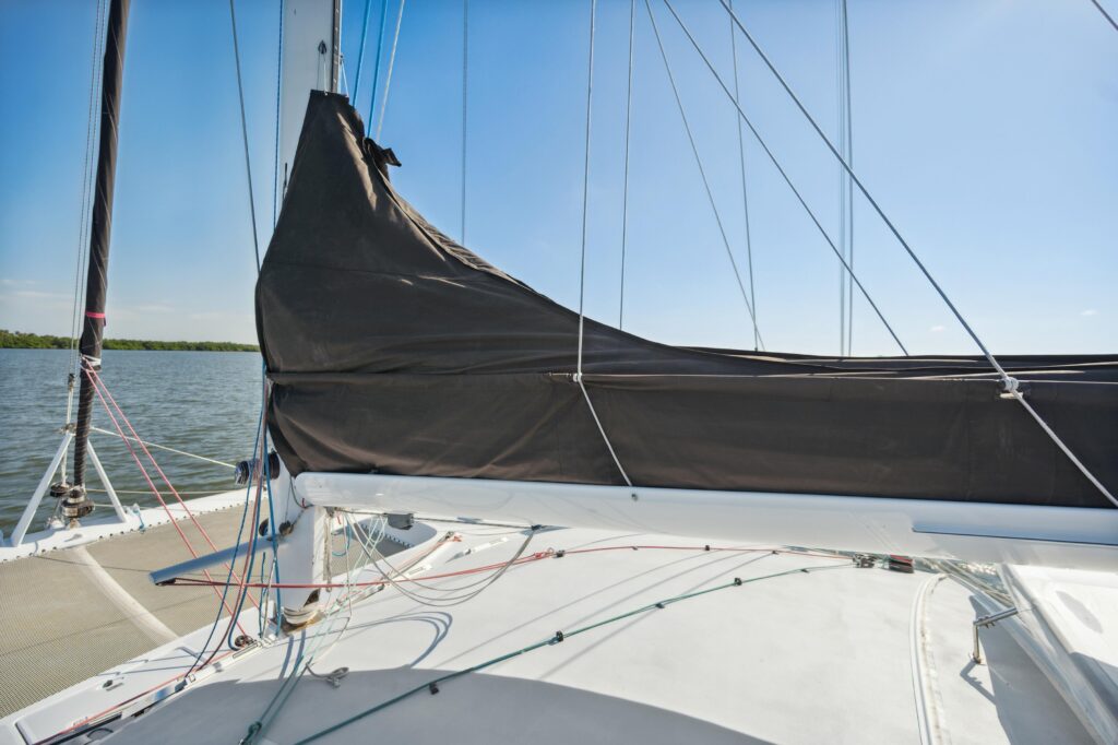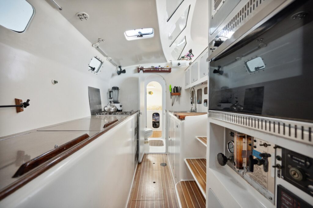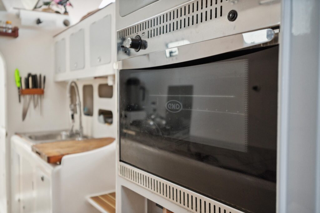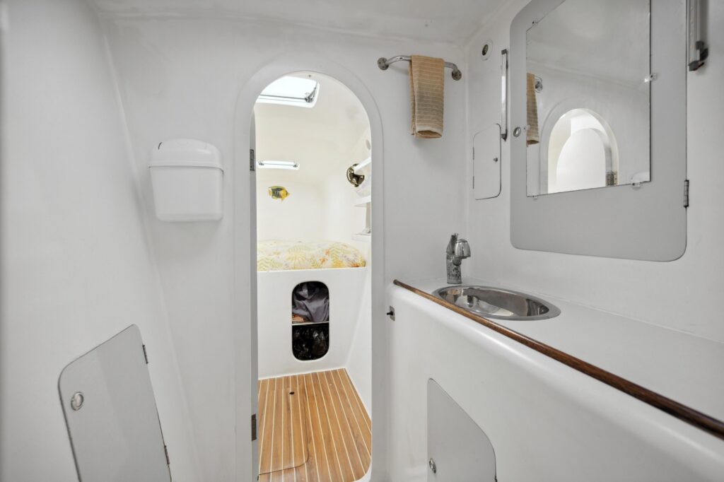 How many cabins: 4 How many can she sleep: 8 + Interior finish: Faired and painted, no liners Salon couch and fabric: Ultraleather Head and showers: 2 heads with showers each + 2 outdoor stern showers Hanging lockers: Yes Navigation station: Yes, forward facing and very large Interior lighting: LED The main salon is accessed via a wide, sliding doorway. The interior is a faired and painted finish throughout clean and light. No frills, no liners to hide mold and unnecessary embellishments on this performance cat. A dining table that can accommodate 5-6 guests dominates to port with a generous wraparound ultra-leather settee. Four large, opening hatches forward provide good ventilation through the salon and 4 windows to each side bring in ample light. A large, forward-facing chart table that doubles as a desk is set to starboard. Mounted on the chart table are nav instruments, Raymarine autopilot, Standard Horizon VHF radio, AIS and a Fusion stereo. An Iridium Go Satphone and EPIRB complement the safety equipment. A lithium-ion battery pack is situated under the main salon settee. The galley is down to port and features large countertops, a 3-burner stove, oven, updated fridge and freezer and ample storage. There is an additional fridge/freezer in the salon. The forward cabins feature double size berths and cabinets. Portholes on the topsides provide abundant natural light. The large aft cabins have impressive headroom with queen size beds athwartships. There is one head with shower in each hull.