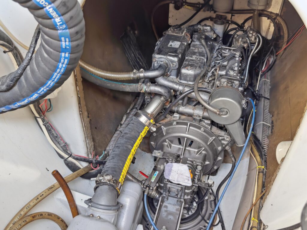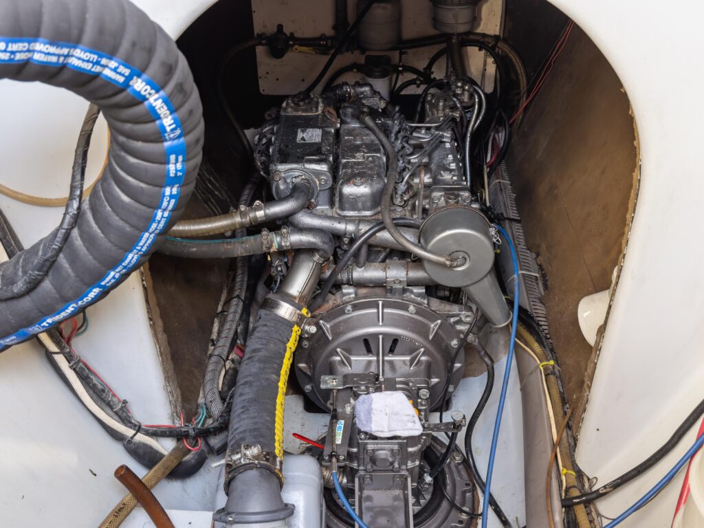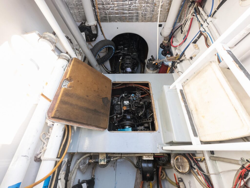 Two Yanmar 54 HP engines are set forward in the transom watertight compartments. Two new SD-60 sail-drives and new Flexofold, 3 blade props were installed in July 2022. A Yanmar 2tn generator with 250 amp DC alternator is located in the port engine room. A clutch-driven water-maker with 60 gal/hour capacity is just behind it. Observe the headroom in the engine room, the easy access to steering, water-maker and other components. Generator type and size: DC Generator 250 amp, Yanmar 2TN Generator hours: 2700 Solar panel type and size of total watts: Sunpower, 2 @ 360 watt Water maker type and size: Aqua-pack 60 gal/hr