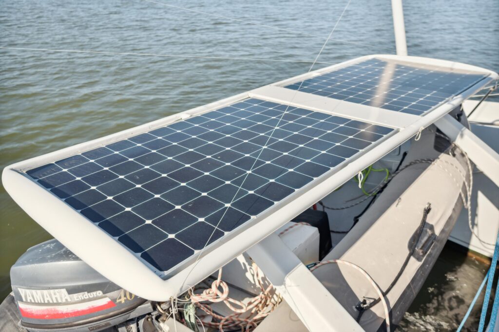 Moving back to the stern, we have a view on the extra-long sugar scoops and you will note the significant distance between the aft beam and transoms - a real design difference here with even the more modern performance cats that offer very little waterline length behind the bridge-deck. The davits hold a new 14 foot RIB dinghy with 40HP Yamaha 2 stroke outboard engine. An elegant, carbon fiber frame holds two 380 watt solar panels. For the pleasure of helming this speedster, two rear tiller steering stations are equipped with Raymarine wind instruments and autopilot repeaters.