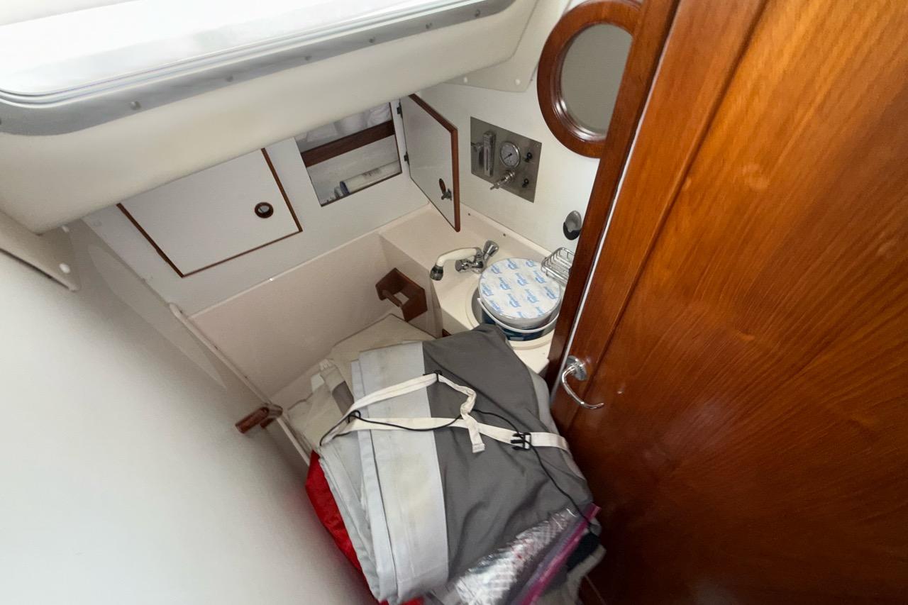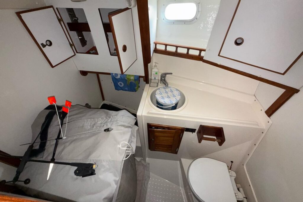 The aft head is manual flush with a wet shower.