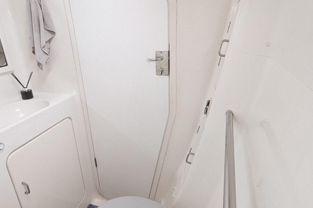All cabins have well developed storage in every possible location with large hanging lockers as well as shelved cabinets and under seat storage. Ideal for live-aboard comfort. Starboard Owners side has stall shower while port hull has hand-held shower in center head unit accessed from forward and aft doors.