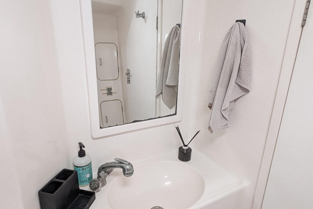 PORT HULL Queen berth forward with latex mattress, full berth aft, center head accessed forward and aft doors, hanging lockers and cabinets, bookshelf at port forward stairwell, towel rails in cabin and head.