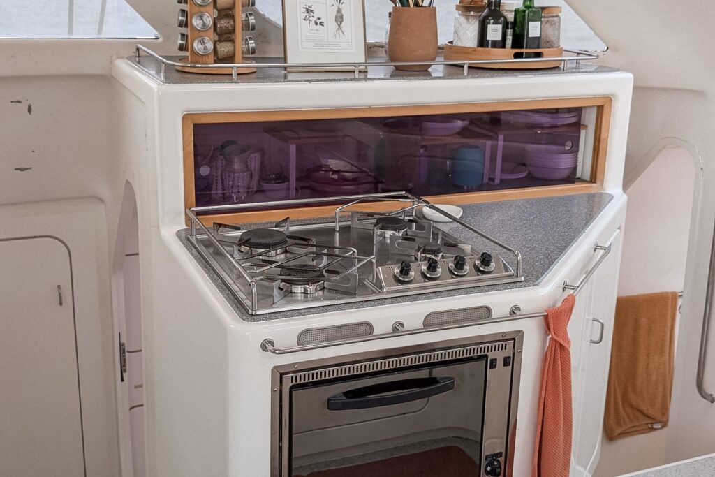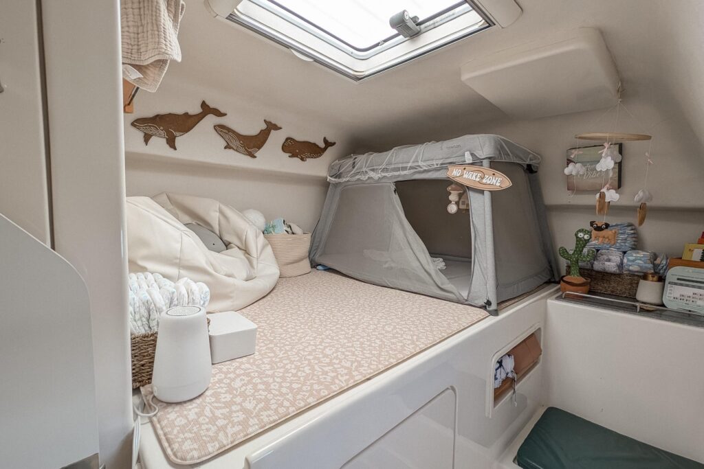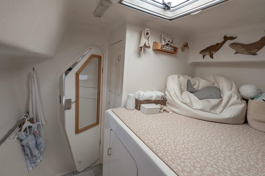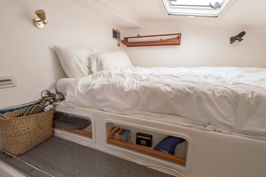 Additional pilot berth in starboard hull, outboard of helm and accessed from deck hatch and starboard head. a very comfortable long single bed with foam mattress, overhead light and fan. When not in use as berth this makes a huge dry storage area.