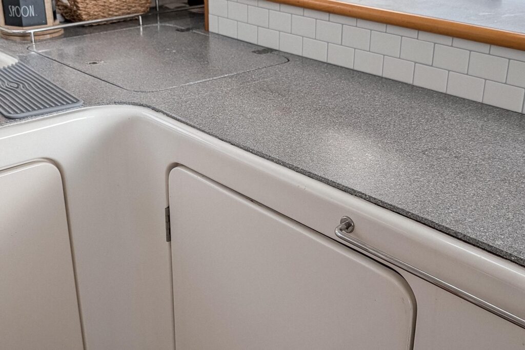 SALON Bar/breakfast counter with one stool, L shaped saloon seating, upholstered cushions (Gray, Alcantara upholstery, new 2021) standing height throughout 1.9m, storage in seating module, table legs modifiable for dining or cocktail height.