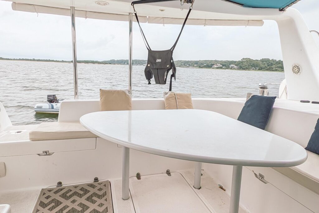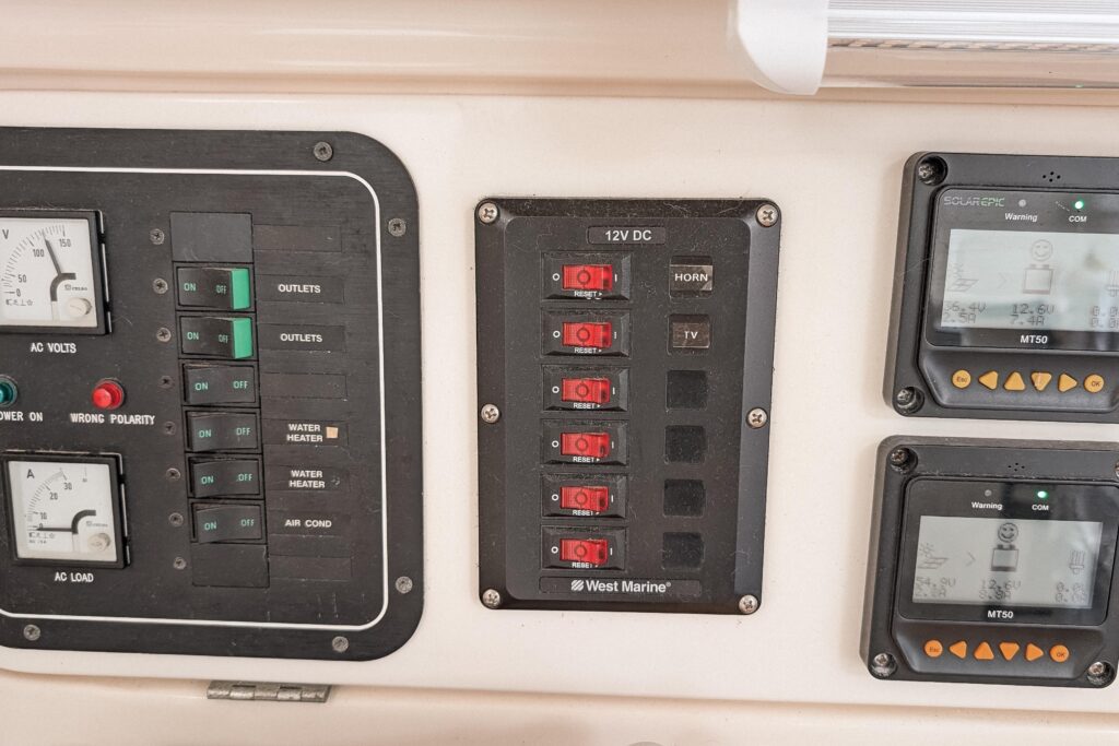 Nav station and AC/DC electrical panel in aft salon. Stool for nav station or dining seating.