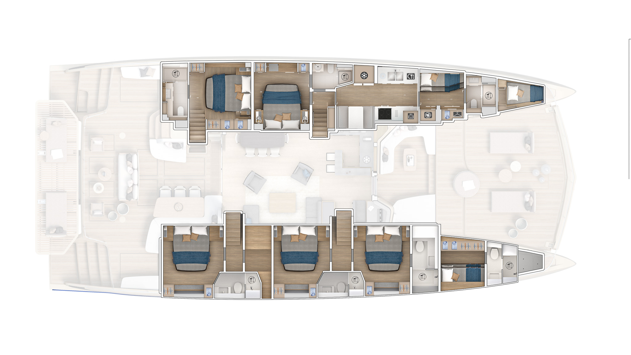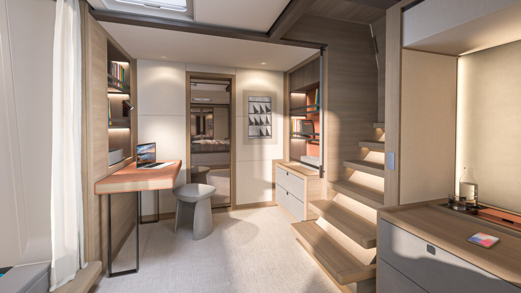 The owner’s cabin features a king-sized berth with a view of the sea, a private terrace, and space for relaxation, designed to offer exceptional comfort.